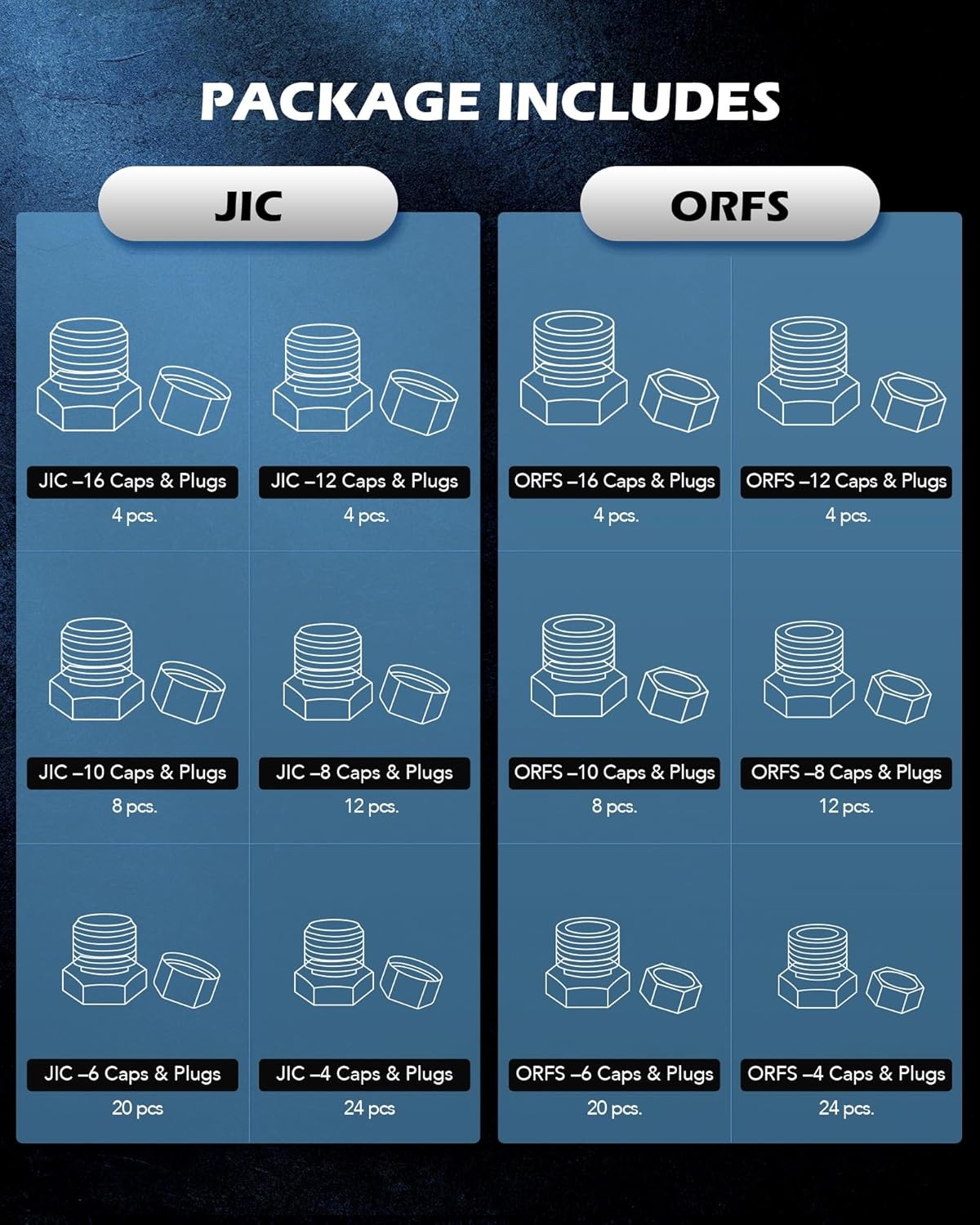 Store New Arrivals Add to Favorite View Feedback Contact Hydraulic Hose Cap & Plug Kit, 144-Piece JIC & ORFS Plug and Cap Assortment Kit for Dash Size 4 6 8 10 12 16, Heavy-Duty Hydraulic Hose Fitting Kit for Industrial Pipe Tube Sealing Description Item dimensions L x W x H 11.4 x 5.9 x 9.5 inches Number of Items 144 Color Silver Material ['Galvanized 45# Steel'] Connector Type Cap Item Weight 7.1 Kilograms Thread Type NPT, Metric Parallel Size JIC and ORFS Exterior Finish Galvanized Number of Pieces 144 Complete Set: Zelcan's 144pc hydraulic hose fitting kit includes both ORFS & JIC caps and plugs in -4, -6, -8, -10, -12, and -16 sizes to match the most common hydraulic fittings. Ideal for equipment maintenance in agriculture, industry, and construction No Slips, No Strips: Our well-cut threads help prevent misalignment, support higher pressure loads, and reduce long-term wear on mating parts. Each cap and plug features a hex head that pairs easily with socket tools for secure handling Reliable & Tight Sealing: With precise 37° flare threads and O-ring face seals following SAE standards, these fittings create a secure seal that blocks oil leaks during service. They help protect your equipment from pressure loss and fluid contamination Built to Withstand Tough Use: Built from galvanized 1045 steel, these JIC caps and plugs can handle tough working conditions. They're built to stand up to vibration, pressure spikes, and rough outdoor environments Neat and Ready: Our hydraulic plug and cap kit comes in a blow-molded case with a custom EVA insert to keep every piece right where it belongs. It’s easy to carry and perfect for organized repairs on-site or in the shop Product description 1 JIC Package List 2 JIC Sizes 3 ORFS Package List 4 ORFS Sizes 1 Precision Engineering 2 Smooth Bottom 3 Hexagonal Shape ABOUT US We offer the best prices around on high quality products. Our E-store includes media such as books, movies, music and games while offering electronics, toys, sporting apparel, clothing, tools, general home, garden items and more. SHIPPING We are always working hard to ensure your package arrives as soon as possible. Please understand that some factors like weather, high postal traffic, and the performance of shipping companies are outside of our control. We offer free shipping to the lower 48 states and ship within 2 business days of payment, usually sooner. We do not accept P.O. Boxes. Please provide a physical address. For shipping outside of the continental USA, we only use eBay's Global Shipping Program.The item is shipped to KY and then sent to the rest of the world. International customers are responsible for all duties and taxes. Continue to check out in order to calculate costs for shipping the item to your country. Messages regarding eBay's Global Shipping Program MUST be directed at eBay EXCLUSIVELY. RETURNS We offer a 30-Day Return Policy on items which you are not completely satisfied with. You have the option for a full-refund or an exchange of the item. No returns are available on items shipped outside of the USA. PAYMENT We accept PayPal. CONTACT US This page content is yet to come Please ad us to your favorite seller and visit again later Thank You CUSTOMER SATISFACTION We try our very best to make sure every customer is completely satisfied. If there's a problem, message us! We're happy to help. WE ACCEPT Copyright © 2021 AutoDS. | All Rights Reserved
