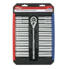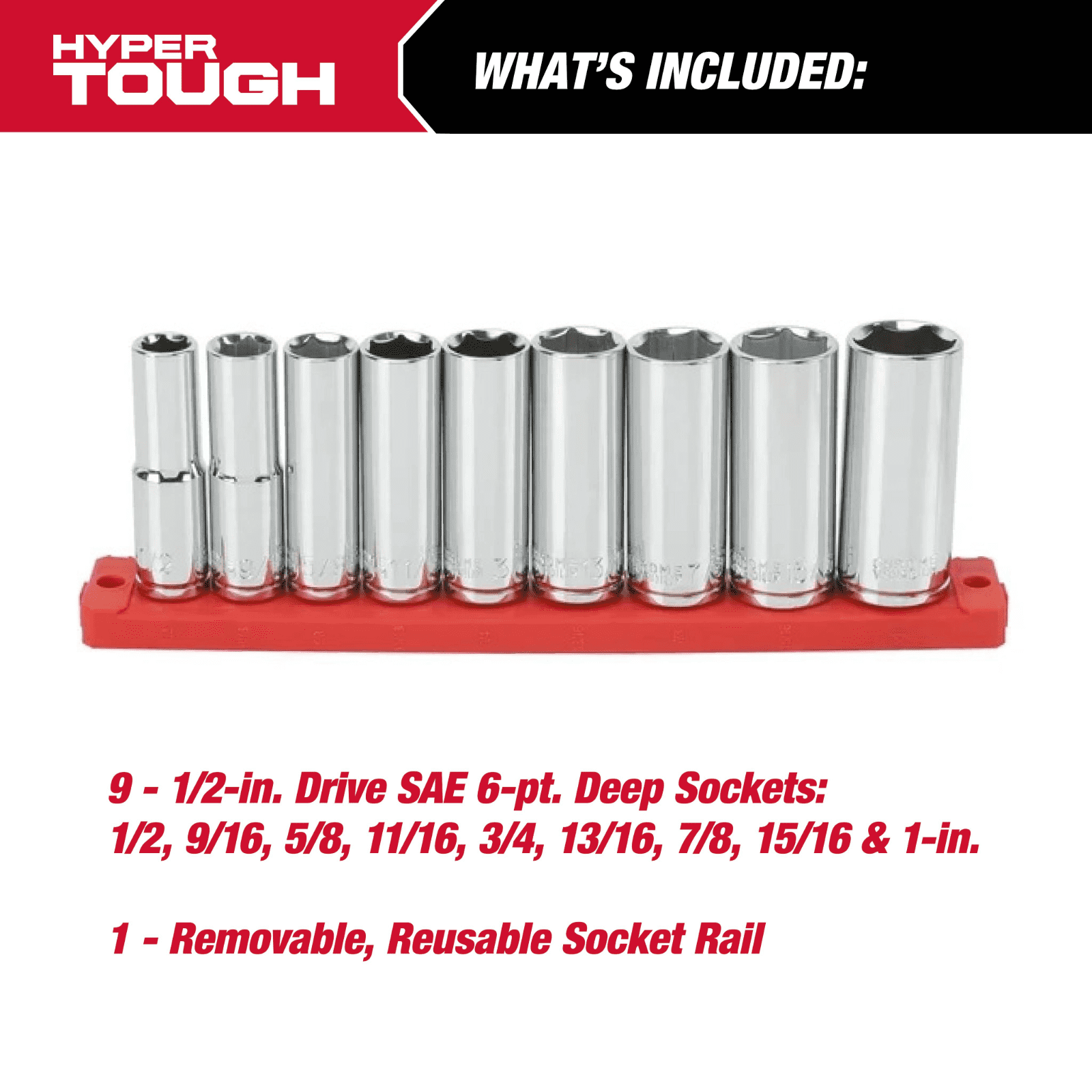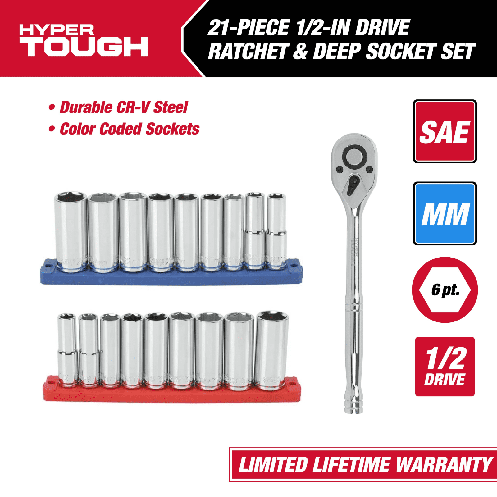 Upgrade your toolkit with the Hyper Tough 21-Piece Ratchet and Socket Set. Built for durability and ease, it features strong chrome vanadium steel sockets, color-coded for quick identification. The 72-tooth ratchet allows precise control, even in tight spaces. This set includes both SAE and Metric sizes, plus removable socket rails for easy organization. Get the job done with confidence and efficiency! Includes 21 pieces: 1/2-inch drive reversible pear head ratchet and deep sockets Made from durable chrome vanadium steel for strength and longevity Color-coded sockets for quick and easy size identification 72-tooth ratchet with a 5-degree arc swing for precise operation in tight spaces Set features both SAE and Metric sockets for versatile use Removable and reusable socket rails for organized storage and easy access