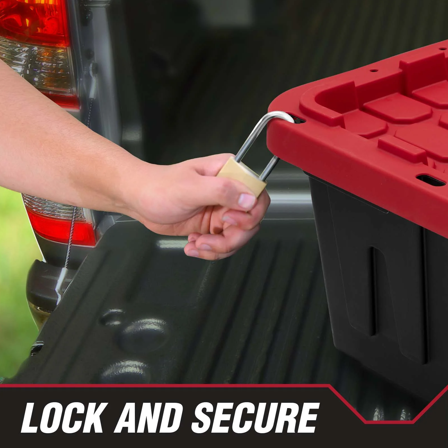 About this item Tough black plastic construction resists rust, dents, stains and peeling to ensure lasting use Stackable lid design creates stability and reduce toppling when multiple units are stacked Snap-Fit Lid lip keeps your content from spilling or falling out Lockable Lid comes with 6 holes ideal for zip-ties or padlocks to keep your items safe and secure Exterior Dimensions - 30.6 IN W x 20.6 IND x 14.3 IN H (77 .7 cm x 52.3 cm x 36.3 cm Easy to clean surface Indoor or Outdoor use, Made from recycled materials Reusable Set of 1 – Includes 1 black base and 1 red lid Weight – 6.6 lbs Available in multiple sizes: 5 Gallon, 12 Gallon, 17 Gallon, 27 Gallon, 40 Gallons and 50 Gallons