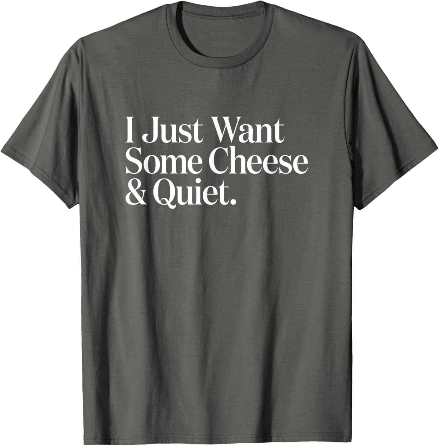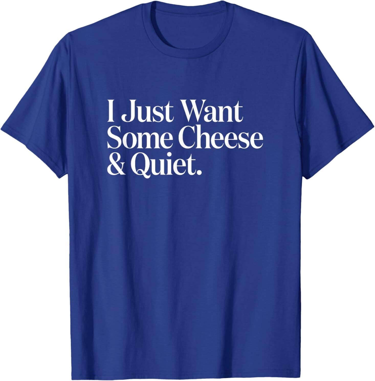 I Just Want Some Cheese and Quiet Funny T-Shirt Designed and Printed in USA Product Features: • Classic Look and Feel: This ultra cotton tee offer the timeless appeal of traditional cotton. The high-quality print enhances its casual appearance. • Material: Made from 6.1-ounce, 100% cotton. (Note: Dark Heather variant is 50% cotton, 50% polyester.) • Durability: Features double-needle stitching on the neck, sleeves, and hem for added durability. Designed for a roomy, unisex fit. • Print Type: DTG (Direct to Garment) • Manufacturer: Gildan 5000, 5000b (Made in USA) Shipping Information: • Handling Time: With POD(Print-On-Demand) product model, we typically require about 3 business-days handling time before shipping. In most cases, our handling time’s , rang e from 1-2 business days. • Delivery Time: • USA: Approximately 2 -6 business days • Canada: Approximately 6-10 business days (We currently don’t offer international Shipping) • Worldwide: Approximately 15-25 business days (We Currently don’t offer international Shipping) • Shipping Carriers: USPS and DHL • Note: Business days exclude weekends and holidays. Return & Exchange Policy: • Quality Guarantee: We stand behind the quality of our products and workmanship . Any defects or errors on our part must result in a refund/ replacement at no charge. • Conditions for Returns: Returns are generally not accepted for user errors such as incorrect selection of sizes, designs, or colors. Returns /Replacements are acceptable for damages such as poor printing results, incorrect size or design caused by us. • Note: Please reach out to us if there are any questions or issue s with your item, we’ll do our best to resolve any issue you might have. Note: • We’re glad to have your support! If you have a moment, y our honest feedback is very valuable to us. Thank you!