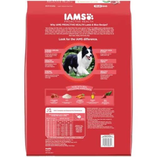 Important Note for Our Valued Customers: To offer you the best prices with free shipping, we occasionally experience shipping delays. If this happens, we’ll notify you immediately, issue a full refund, and invite you to place a new order at your convenience. To keep costs low, we sometimes reuse branded packaging boxes for shipments—we appreciate your understanding if you receive your order in repurposed packaging. Rest assured, all products we sell are 100% brand new, unopened, and freshly manufactured, including pet food and human-grade items, with a minimum 8-month shelf life remaining. If any issues arise, please contact us first—we’re committed to resolving them quickly. If you’re not completely satisfied, we offer a full refund with no hassle. Thank you for your trust and support! Description Your dog will come running when they hear the sound of this Lamb Meal and Rice Dry Dog Food from Iams poured into their bowl. This proactive health dog food has premium protein as the first ingredient, providing your dog with the protein they need for strong muscles. It also has a tailored fiber blend with prebiotics and beet pulp for healthy digestion, and is enriched with antioxidants for a healthy immune system. With a crunchy texture that helps reduce plaque build-up, this lamb dry dog food will satisfy your dog's taste buds while keeping them healthy. highlights Lamb and rice dry dog food helps keep your canine healthy and satisfied Features premium protein as the first ingredient for strong muscles Fiber blend of probiotics and beet pulp for healthy digestion Enriched with antioxidants for a healthy immune system Crunchy texture of the kibble helps reduce plaque buildup