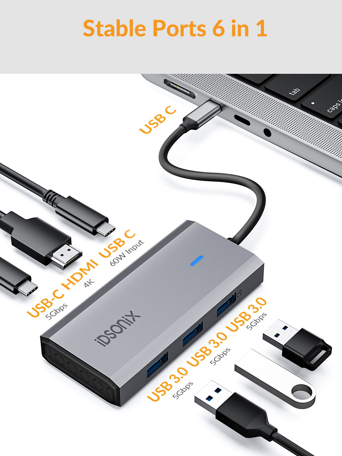 5 IN1 About this item: đ» ă5 in 1 USB C Hubă The usb c hub adapter multiport equipped with USB 3.0 / USB 2.0 *2 , 4K HDMI, PD 60W charging port. đ» ăHD 4K USB C Hubă The USB C hub multiport adapter provides you with a lifelike 4K HDMI HD image. đ ăHigh Speed 5Gbps Transmissionă iDsonix usb c hub can transfer 2Gb large files within 5s, ten times faster than usb 2.0. The usb c hub provides 3 USB 3.0 ports to ensure a stable connection for connecting multiple USB peripherals such as flash drives, hard drives, keyboards, mice, MP3 players and more. ⥠ă60W Power Deliveryă USB C HUB supports fast charging (the specific input power is related to your charger), perfect for charging MacBook Pro/Air or other USB C devices. 6 IN1 - BLACK About this item: ăAll in One USB C Hubă Equipped with one 4K HD HDMI port, one USB 3.0 ports, and one USB 2.0 ports, one USB-C 3.0 input port,1 TF and 1 SD card slotsïŒ100W PD charging,meet your basic needs. All ports can be in use simultaneously, plug and play, no additional driver required. ăHigh-speed & Stable date transferă Transfer and backup your files at speeds up to 5Gbps via USB 3.0 port. Thatâs fast enough to transfer images, files, and video in seconds. The USB C hub is also equipped with USB 2.0 port, which is convenient for you to connect a mouse,keyboard and other USB device. ăSmooth & HD Video Outpută The USB C to HDMI docking station support 4K@30Hz or 1080p@60Hz HD video output. Mirror or expand the screen to HDTV, monitor or projector via HDMI port, perfect for watching the NBA season, playing game, working at home and online meeting. 6 IN1 About this item: đ» ă6 in 1 USB C Hubă The usb c hub adapter multiport equipped with USB 3.0 , 4K HDMI, PD 60W charging port.It can perfectly settle the problem of only one USB C port of your laptop. All hub ports can work at the same time. đ» ăHD 4K USB C Hubă The USB C hub multiport adapter provides you with a lifelike 4K HDMI HD image. The output screen is more stable, the screen does not freeze, and the mouse and keyboard đ ăHigh Speed 5Gbps Transmissionă iDsonix usb c hub can transfer 2Gb large files within 5s, ten times faster than usb 2.0. usb c hub provides 3 USB 3.0 ports to ensure stable connection for connecting multiple USB peripherals such as flash drives, hard drives, keyboards, mice, MP3 players and more. ⥠ă60W Power Deliveryă USB C HUB supports fast charging (specific input power depends on your charger), perfect for charging MacBook Pro/Air or other USB C devices. đ€ ăAfter-Sales 1v1 Service ă - iDsonix USB C Hubs have been rigorously tested before they get into your hands, and offer you 36-month warranty, please be confident to buy. 6 IN1 - clear đ ă6 IN 1 Docking Stationă: This IDSONIX type-c semi transparent expansion docking station entends your one usb C port to 6 ports with 3*USB3.0 interfaces(5GGbps), 1*gigabit network interface,1*HDMI(4K@30Hz), 1*Type-C charging(PD 100W), supporting many mobile phones and computers to use and connect. đ ă5Gbps High-speed Transmissionă: 3 USB 3.0 ports are compatible with USB 2.0/1.1 and others with a transmission rate of up to 5Gbps, ten times faster than USB 2.0 (480Mbps). A 1G file can be transferred in 3-4 seconds. The IDSONIX type-c semi transparent expansion dock uses various functional independent chips internally, supporting multifunctional operation and maintaining stable and smooth use. đ ă4K HDMI+PD 100Wă: This docking station supports 4K@30Hz Video transmission, mobile phones and computers can be connected to televisions or projection devices, transforming our small screens into large ones. You can enjoy a cinema-like visual feast at home. The PD interface can achieve an output power of 100W, without worrying about the host device running out of power during use đ ăTransparent Docking Stationă: The docking station is made of transparent PC and aluminum alloy. It can clearly see the internal components and feel a full sense of technology. The linear design accelerates heat dissipation and can stably and safely operate multiple devices. đ ăWide Compatibilityă: IDSONIX USB C docking station is widely competible with Windows/Linux/Mac OS systems,and most of USB C devices like Dell XPS13/15/17, HP, Mac book,Huawei, Lenovo, Surface, Samsung, etc. 8 IN1