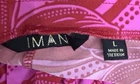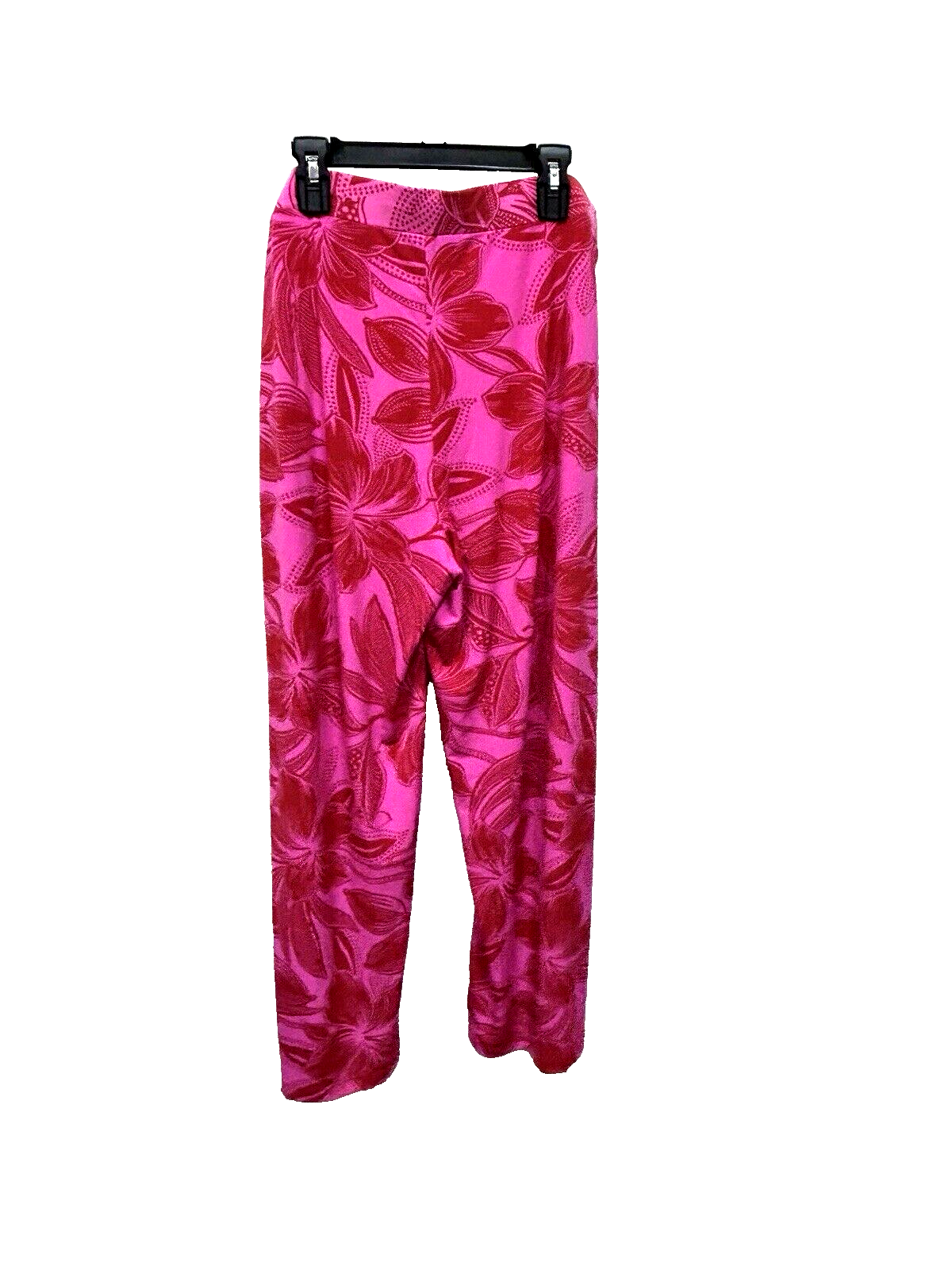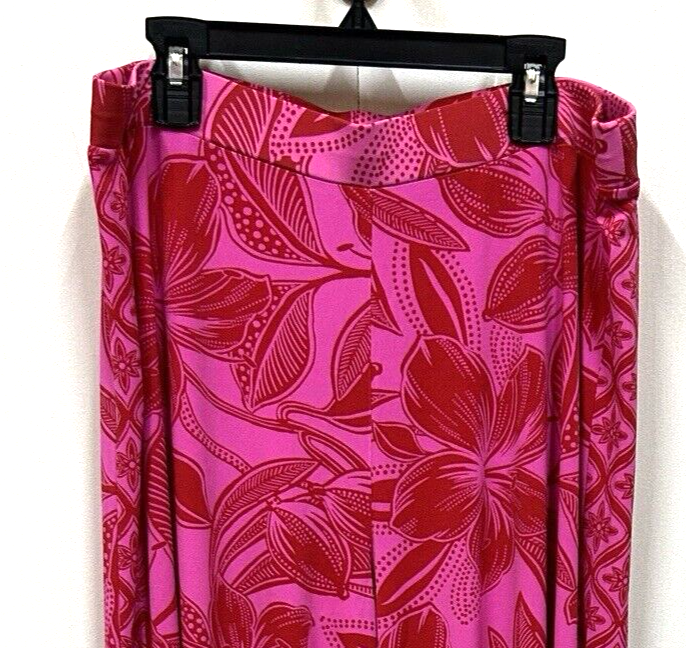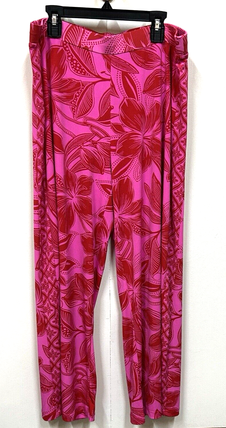 IMAN Women's Wide Legged Spandex Pink Floral and Red Flair Pants in size Large. The pants feature a beautiful floral pattern and a pull-on closure for easy wear. The elastic waist stretches further to provide a comfortable fit, and the pants are made of a durable polyester and spandex blend that is machine washable. These dress pants have a flat front and a wide-leg style that adds a touch of sophistication. The nylon fabric type gives them a sleek and stylish look.