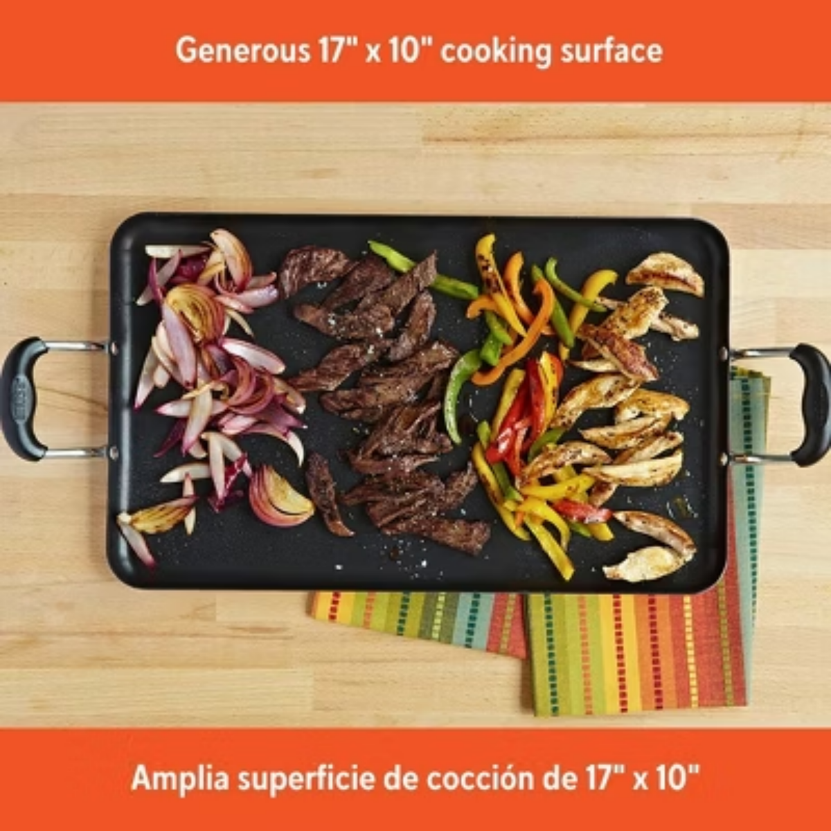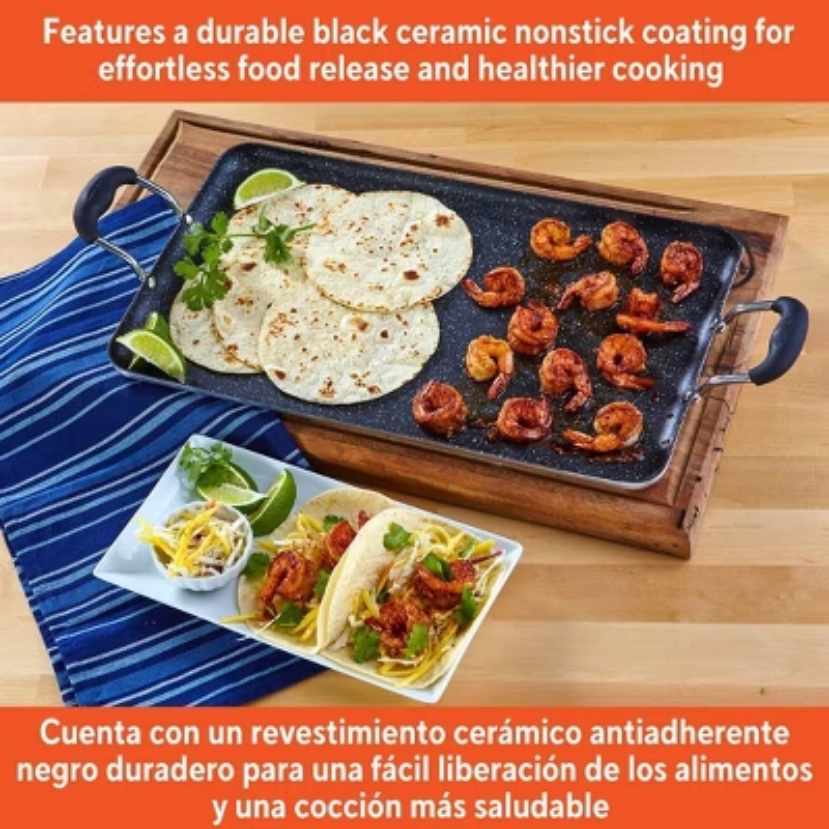 Description TThe IMUSA 17” x 10” Ceramic Double Burner Griddle is crafted from aluminum and coated with a sleek black Ceramic finish. Its Ceramic non-stick coating ensures effortless food release and promotes healthier cooking. Designed for even heat distribution and retention, the griddle also features cool-touch dual side handles for safe and easy handling. Ideal for warming tortillas, making quesadillas, and preparing fajitas, it’s equally great for breakfast dishes like French toast, grilled cheese sandwiches, and pancakes. Perfect for everyday meals, gatherings, and festivities, its spacious surface allows for cooking multiple portions at once, reducing preparation time and making it a versatile kitchen essential. Trust the IMUSA Ceramic Double Burner Griddle for balanced, home-cooked meals. It will surely become your kitchen's beloved companion, uniting tradition, and innovation in every delectable creation and elevating your culinary experience. highlights SPACIOUS 17” X 10” SURFACE: This Double Burner Griddle offers a large cooking area, perfect for preparing multiple portions at once, making meal prep faster and more efficient for family gatherings and everyday meals STYLISH AND DURABLE COATING: Made of aluminum and coated with black ceramic, this non-stick griddle combines a sleek look with durability, ensuring a reliable cooking experience while promoting healthier cooking with easy food release EFFICIENT HEAT DISTRIBUTION: Designed for even heat distribution and retention, this griddle features cool touch dual side handles for comfortable and safe operation, making it a versatile cooking tool for all your favorite dishes MULTI-PURPOSE USE: Ideal for warming tortillas, making quesadillas and fajitas, this griddle is also great for breakfast favorites like pancakes, grilled cheese sandwiches, and French toast, adding variety to your cooking PERFECT FOR EVERYDAY COOKING: This kitchen essential is perfect for family meals and festive gatherings, providing ample cooking space while reducing preparation time, making it a fantastic addition to any kitchen