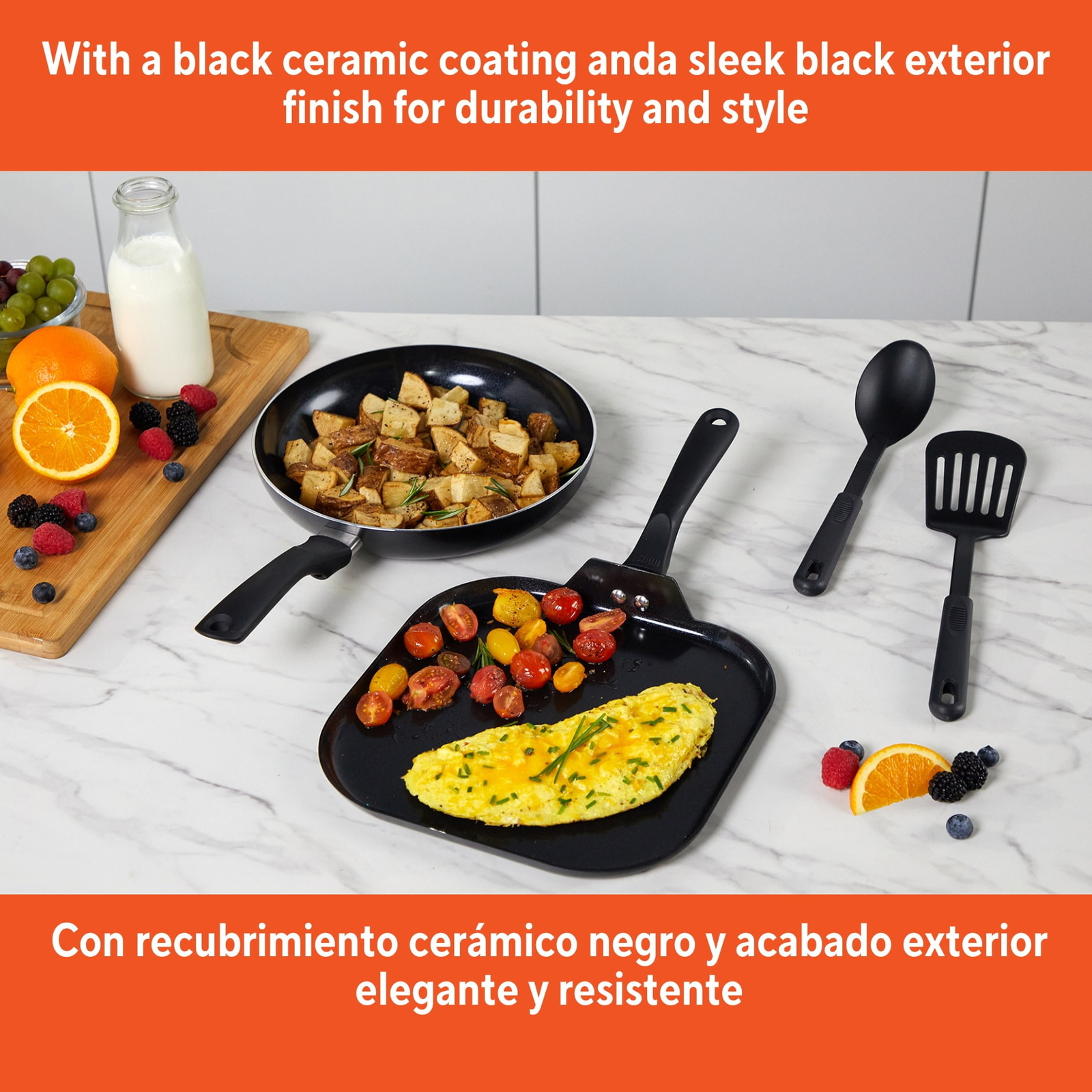 COOKING MADE SIMPLE: This 4-piece set includes a 10” fry pan and a 10.5” square griddle offering the right size for both small and large meals, perfect for preparing everything from simple dishes to more elaborate recipes with ease,STYLISH & SAFE: Made from aluminum with a black ceramic non-stick coating and a sleek black exterior, this set combines a modern look with durability and safe cooking for a healthier kitchen experience,MULTI-FUNCTIONAL SET: This set includes a fry pan, a square griddle, a slotted turner, and a solid spoon, offering versatility for cooking multiple recipes, from frying and sautéing to warming tortillas or toasting sandwiches, all with ease, About this item COOKING MADE SIMPLE: This 4-piece set includes a 10” fry pan and a 10.5” square griddle offering the right size for both small and large meals, perfect for preparing everything from simple dishes to more elaborate recipes with ease STYLISH & SAFE: Made from aluminum with a black ceramic non-stick coating and a sleek black exterior, this set combines a modern look with durability and safe cooking for a healthier kitchen experience MULTI-FUNCTIONAL SET: This set includes a fry pan, a square griddle, a slotted turner, and a solid spoon, offering versatility for cooking multiple recipes, from frying and sautéing to warming tortillas or toasting sandwiches, all with ease VERSATILE COOKING: Ideal for making burgers, bacon, warming tortillas, toasting sandwiches, pan frying, stir frying, sautéing meat, fish, eggs, and more, this set gives you the freedom to cook a wide range of delicious meals with ease EVERYDAY KITCHEN HERO: Perfect for daily cooking, this set is ideal for dry heat cooking like pan frying, sautéing, and grilling, providing the versatility and convenience needed for everyday meals IMUSA Nonstick Ceramic Cookware Set 4-Pieces, 10" and 10.5" Inches, with Stay-Cool Handles, Aluminum, Black The IMUSA 4pc White Ceramic Value Aluminum Cookware Set in Black is an excellent choice for anyone looking to enhance their kitchen with versatile and high-quality tools. This set includes two different-sized fry pans, along with a slotted turner and a solid spoon, providing everything you need for a variety of cooking tasks and easy serving. Each frypan features a natural nonstick ceramic coating, promoting healthier cooking with minimal oil and ensuring effortless food release and easy cleanup. The two fry pans of the IMUSA White Ceramic Value Aluminum Cookware Set are perfect for everyday home use and are ideal for a range of dry heat cooking techniques, including pan frying, stir-frying, and sautéing. They are well-suited for preparing meats, fish, eggs, and more, making it easy to cook a wide variety of meals. The included slotted turner and solid spoon add to the set’s versatility, allowing you to serve your dishes with ease and precision. The durable aluminum construction of the cookware ensures even heat distribution, helping you achieve perfectly cooked meals every time. The elegant black exterior and white ceramic interior give the set a modern and stylish look, complementing any kitchen decor. Whether you are preparing a simple breakfast or a complex dinner, the IMUSA White Ceramic Value Aluminum Cookware Set provides the tools you need to cook with confidence and ease, making it a valuable addition to any kitchen. Trust the IMUSA White Ceramic Value Aluminum Cookware Set for balanced, home-cooked meals. It will surely become your kitchen's beloved companion, uniting tradition, and innovation in every delectable creation and elevating your culinary experience. On Jun 16, 2025 at 19:59:27 PDT, seller added the following information: