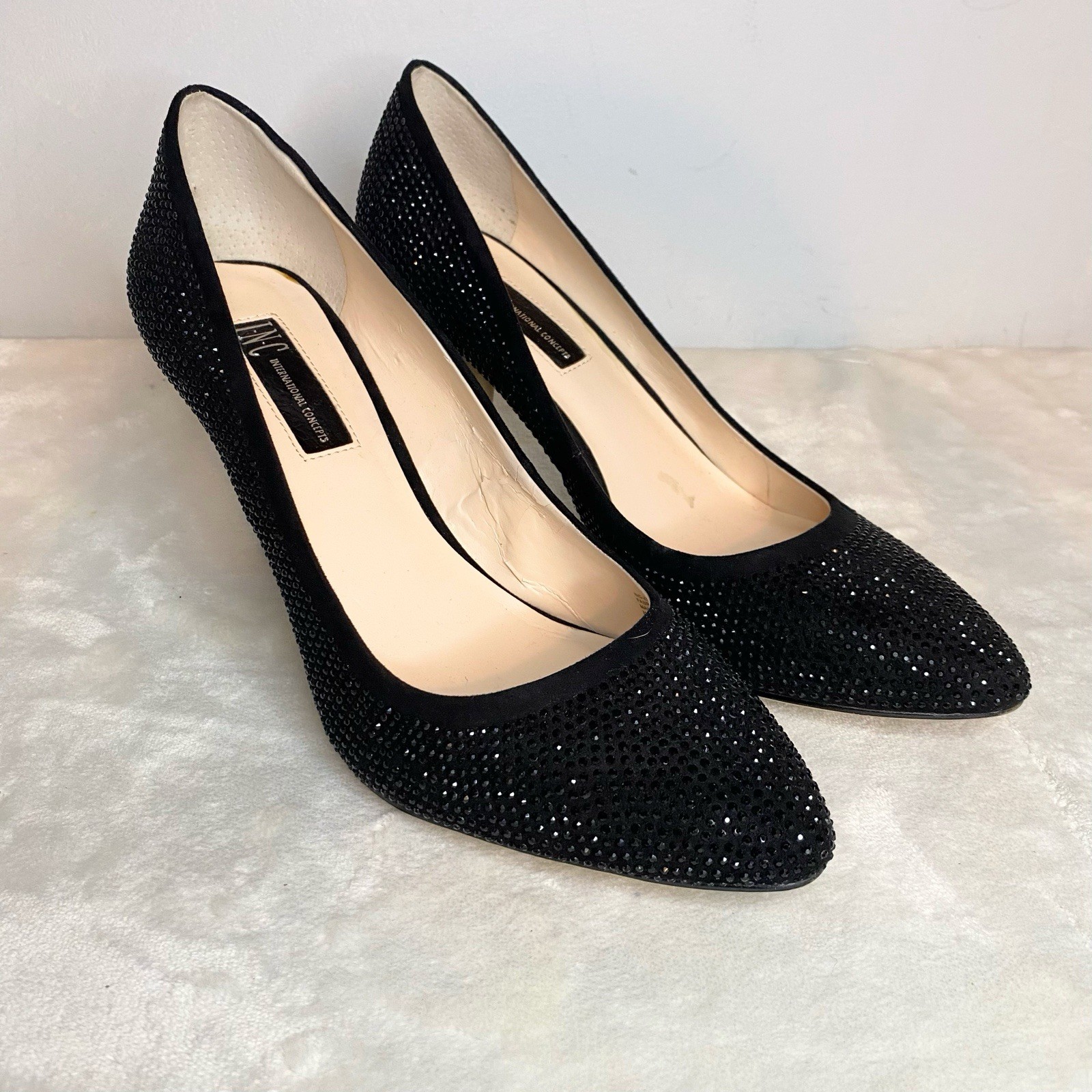 Classic elegance. I.N.C. International Concepts®'s Zitah pumps put a nice polish on anything, from worksuits to dresses. Features 3" covered heel Pointed-toe slip-on pumps Memory foam sock for added comfort Featured on our Spring It List Available in Medium(M) Created for Macy's Manmade, suede, fabric or leather uppers; manmade sole. Worn once for a New Years Party. Very, very sparkly under the dim lights. In fantastic condition only a bit of wear on soles as normal. Clean interior, no damage to any of the crystals. Size 9 M width No box Smoke free home Fast shipping Was $90