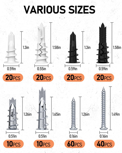 Just got these drywall anchors and they’re a game-changer! The mix of metal and plastic anchors holds up perfectly, and the included screws make installation a breeze. The case keeps everything organized, and the self-drilling feature saves so much time. Super sturdy for hanging shelves, mirrors, or TVs—no more worrying about things falling off the wall. Highly recommend for any DIY project!