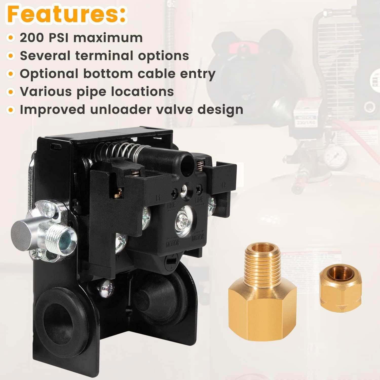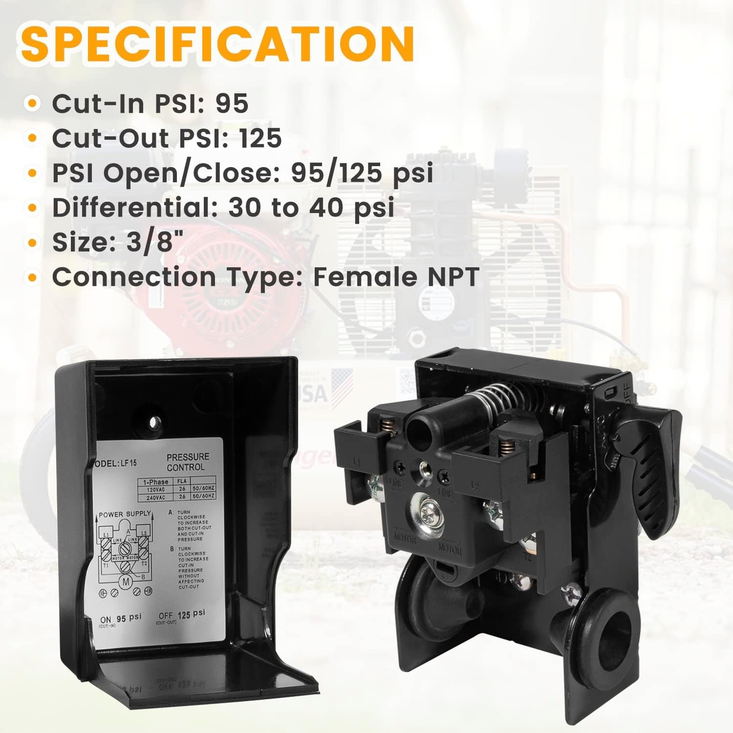 This pressure switch is a perfect replacement for my Ingersoll Rand compressor—durable steel and copper construction ensures long-lasting performance. The precise 95-125 PSI range keeps my compressor running efficiently, and the unloader valve reduces strain on startup. Easy to install and works flawlessly with SS3 and SS5 models. Highly recommended for a reliable upgrade!