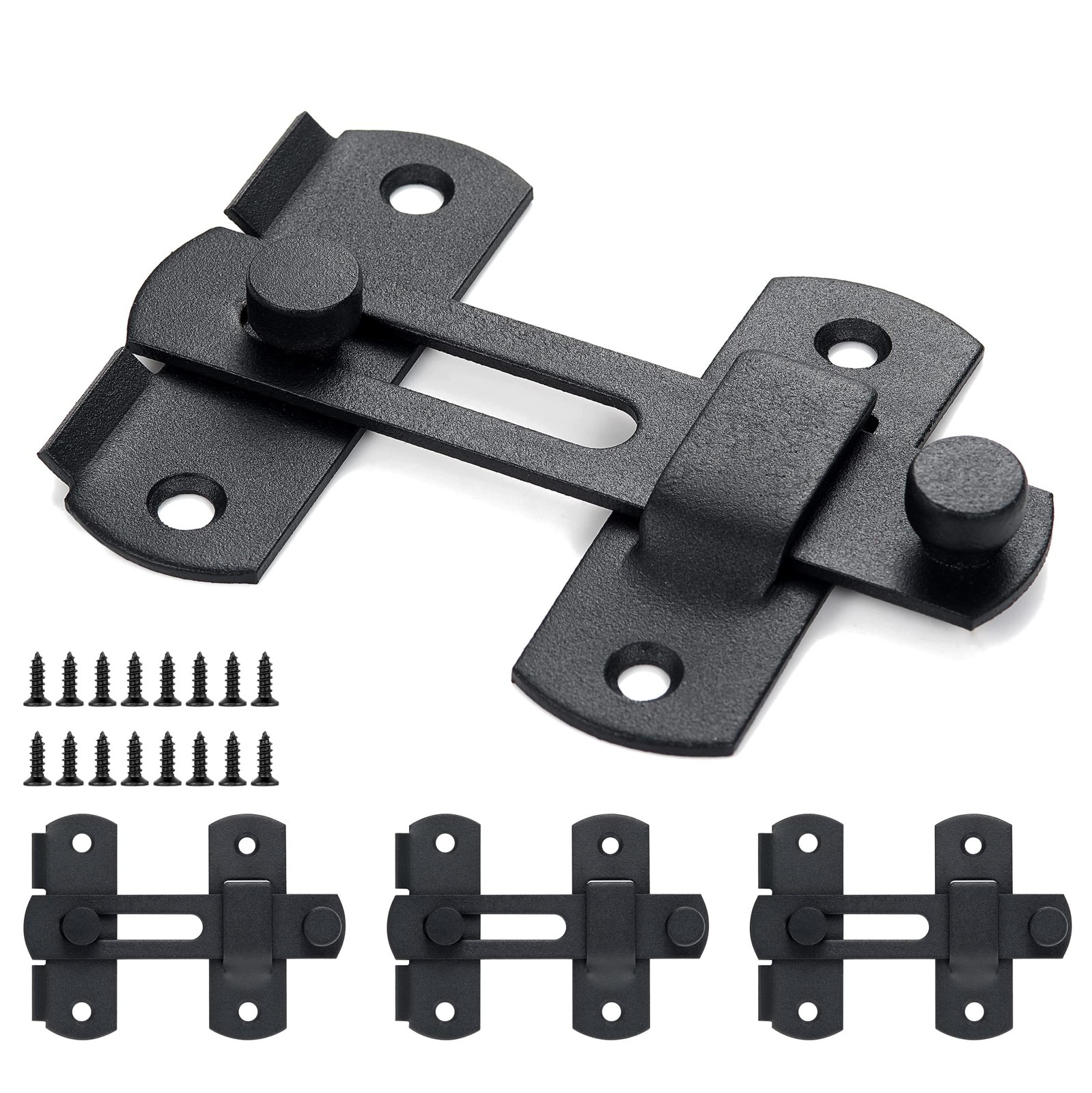【Material & Features】— Gate Latch Is Constructed of High quality stainless steel, easy to clean,do not fade or rust,Matte Black finish,build to resist daily scratches,corrosion and tarnishing. 【size】— 2.75 in X 2.02 in. please refer to the product size picture for details.【Easy to Install】— The door latch is included 2 part: Rotating design, and each door latch had prepared 4 screws, easy to install and use.【Application】— Stainless steel barn sliding door locks are suitable for most door locks, It is suitable for door and window safety, fitting room, bathroom, cabinet, barn door,drawer, furniture etc. it can also be used as the lock of small pet cage, to save space and design space for all wooden doors. 【Material & Features】— Gate Latch Is Constructed of High quality stainless steel, easy to clean,do not fade or rust,Matte Black finish,build to resist daily scratches,corrosion and tarnishing. 【size】— 2.75 in X 2.02 in. please refer to the product size picture for details. 【Easy to Install】— The door latch is included 2 part: Rotating design, and each door latch had prepared 4 screws, easy to install and use. 【Application】— Stainless steel barn sliding door locks are suitable for most door locks, It is suitable for door and window safety, fitting room, bathroom, cabinet, barn door,drawer, furniture etc. it can also be used as the lock of small pet cage, to save space and design space for all wooden doors. 【Package Included】—Door latch × 4, screws × 16.