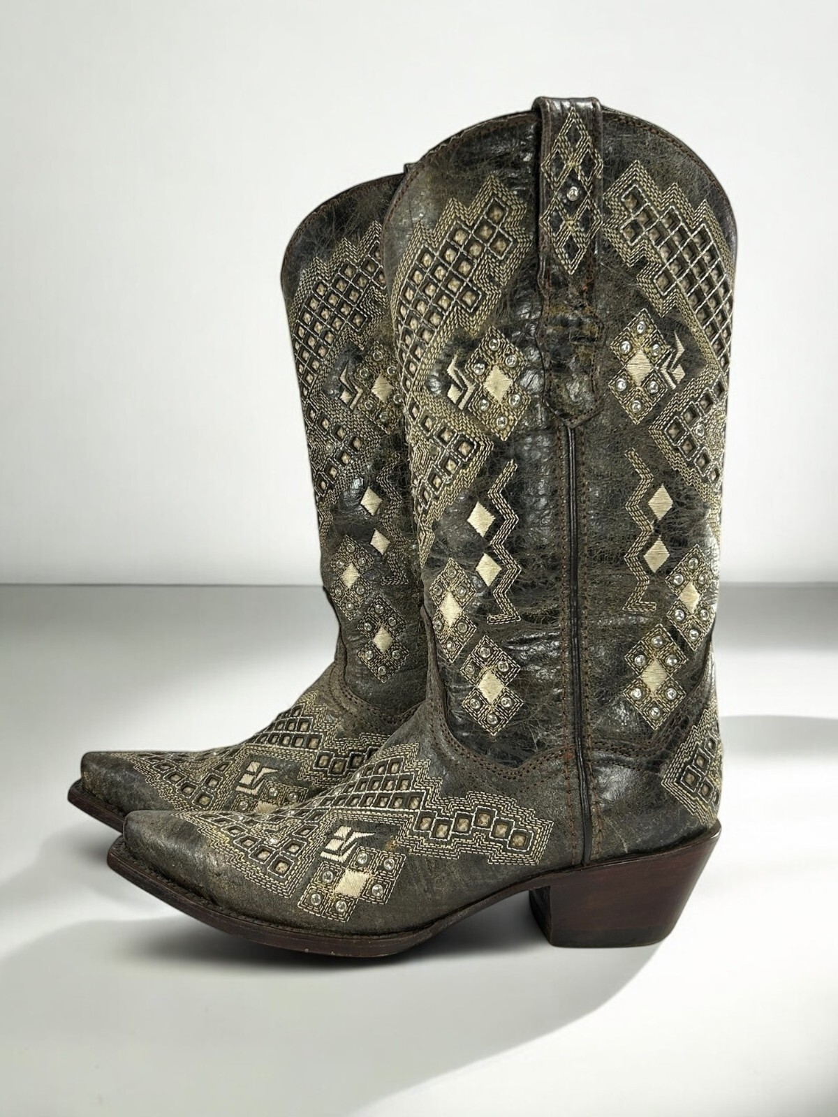 In pristine preowned condition with minor wear on the leather/tops but some minor wear on bottom of boots. Slightly broken in and definitely ready for the dance floor! Innovation Boots Womens size 7M - standard size Made in Mexico -A unique and original embellished and embroidered design -Plenty of glam/rhinestones to make any outfit pop! -Wood base soles -Genuine leather construction -Rhinestones throughout -Heel height of about 1.5" #womensboots #westernwear #cowgirlcore #cowgirl #embellished #madeinmexico #leatherboots #genuineleatherboots #womensleatherboots #jeweled #jeweledboots #westernboots