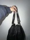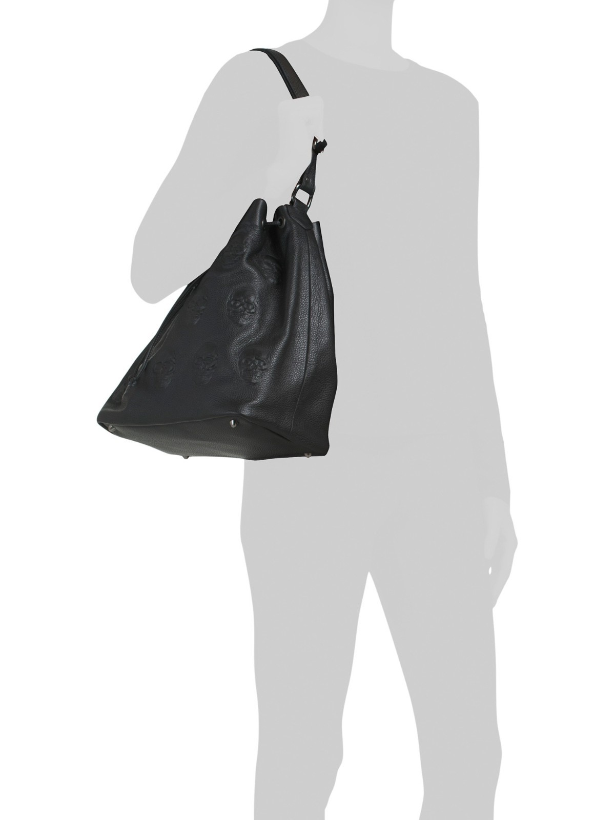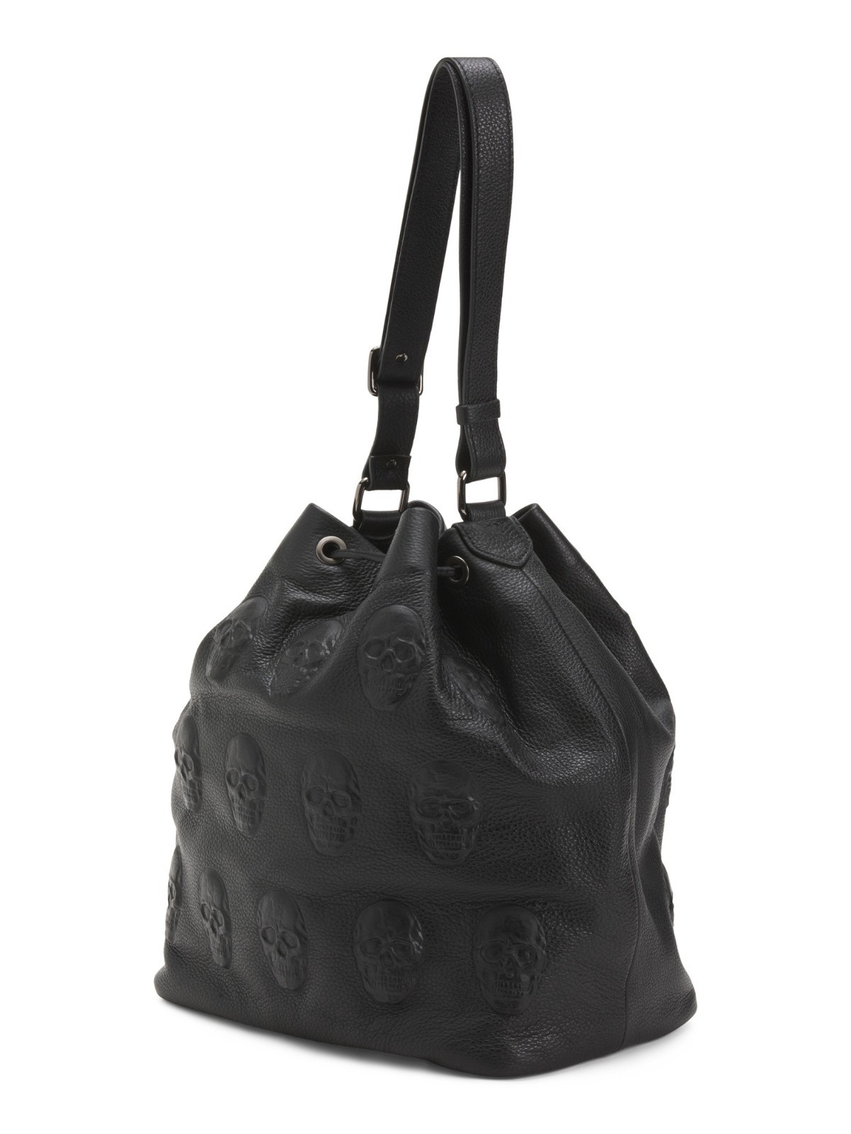 skull embossed design, metal feet, pebbled finish, adjustable carry handle 14in W x 11.5in H drawstring closure 2 interior slip pockets, 1 interior zip pocket leather imported, made in Italy