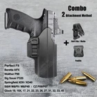 High Quality Military & Police Grade Polymer OWB Holster Specially Designed For Fast Draw During Duty Or Shooting Competition. This is a Combo Holster Comes With Paddle and Belt Clip Attachment ,which means you can swap paddle type to belt clip type with the Allen key by yourself. Outside Waistband Tactical Holster This holster fits 9mm, 10mm, and .40 caliber firearms but is not compatible with .45 caliber models. Holster Fit Glock 19 (Gen 1-5) Glock 19X Glock 17 (Gen 1-5) Glock 21 (Gen 1-5) Glock 26 (Gen 1-5) Glock 27 (Gen 1-5) Glock 31 (Gen 1-5) Glock 32 (Gen 1-5) Glock 33 (Gen 1-5) Glock 45 (Gen 1-5) Glock 22 (Gen 1-4) Glock 23 (Gen 1-4) Holster Fit Smith & Wesson M&P 9 M2.0 4.25" 9mm Luger Smith & Wesson M&P 10mm M2.0 4" 10mm Auto Smith & Wesson M&P 10mm M2.0 4.6" 10mm Auto Smith & Wesson M&P 40 M2.0 3.6" Subcompact .40 S&W Smith & Wesson M&P 9 M2.0 3.6" Compact 9mm Luger Smith & Wesson M&P 9 M2.0 3.6" Subcompact 9mm Luger Smith & Wesson M&P 9 M2.0 4.0" Compact 9mm Luger Smith & Wesson M&P 9 M2.0 5" 9mm Luger Holster Fit Walther P99 AS 9mm Luger Walther P99c 9mm Luger/.40 S&W Walther PPQ 9mm Luger Holster Fit Springfield XD 9, XD 40, 5" 9mm Luger/.40 S&W Springfield XD 9, XD 40, Full Size 4" 9mm Luger/.40 S&W Springfield XD MOD.2 4" Service 9mm Luger Springfield XD MOD.2 Subcompact 3.3" 9mm Luger Springfield XD Subcompact 3" 9mm Luger/.40 S&W Springfield XD-M 4.5" 10mm Auto Springfield XD-M 5.25" Competition 10mm Auto Springfield XD-M Elite 3.8" 9mm Luger Springfield XD-M Elite 4.5" 9mm Luger Springfield XD-S MOD.2 .40 S&W Holster Fit Beretta APX 9mm Luger/.40 S&W Beretta APX Compact 9mm Luger/.40 S&W Beretta APX Centurion 9mm Luger/.40 S&W Beretta APX Centurion Combat 9mm Luger Note: Not compatible with Beretta APX A1 Carry and Beretta APX Carry 3.5". Holster Fit Tisas Zigana PX-9 9mm Holster FitBRG9 Elite 9mm Holster Fit Sig Sauer P320 (9mm/.40) series all models Sig Sauer P220 (9mm/.40) series all models Sig Sauer P229 (9mm/.40) series all models Sig Sauer SP2022 (9mm/.40) series all models Sig Sauer P226 (9mm/.40) series all models Sig Sauer P228 (9mm/.40) series all models Holster Fit CZ P-07 9mm Luger CZ P-09 9mm Luger CZ P-10 C 9mm Luger CZ P-10 F 9mm Luger CZ P-10 M 9mm Luger CZ P-10 S 9mm Luger CZ P-10 SC 9mm Luger Holster Fit Sarsilmaz SAR 9 Sarsilmaz SAR 9X Sarsilmaz SAR 9 Compact Sarsilmaz SAR 9 SP Sarsilmaz SAR 9 Sport Sarsilmaz SAR 40 Sarsilmaz SAR K2P Sarsilmaz SAR B6 Sarsilmaz SAR B6C Sarsilmaz SAR B6C 7.65 Sarsilmaz SAR B6C-LR Sarsilmaz SAR B6C-S Sarsilmaz SAR CM9 Sarsilmaz SAR ST9 Sarsilmaz SAR 2000 Sarsilmaz K12 Sport Sarsilmaz K12 Sport X Sarsilmaz K11 Sarsilmaz AR-24 Sarsilmaz AR-24K Sarsilmaz Kilinc 2000 Light Sarsilmaz Kilinc 2000 Mega Sarsilmaz P8 L Sarsilmaz P8S ( I t perfect fit the gun with Optic Mou nt Mini Sight a bove on the end of the barrel , B ut without laser and no embedded chassis, and no flashlight style ) Ease and Comfort Push side buttons to achieve the fast opening and closing, unique design allows for belt carrying or vest carrying, perfectly used by duty holsters, uniformed law enforcement officers, security personnel, military personnel, private persons, and shooting sports holsters. And it fits closer to the body which can achieve better concealment under clothes. High S afety Secure Level II Retention - Locking system restrain pistol in the holster to ensure ultimate safety, activate the release by pressing the button with the index finger to achieve gun access . A djustable Easily set Holster 360 degrees to your desire position with Allen key, compatible belt width up to 2 inch . Tough & Durable Material Custom-molded body made of polymer stronger than leather that will wear out, adapt to every bad environment In the Package: · 1*Holster with Paddle Attachment · 1*Belt Clip Attachment · 1*Allen Key Shipping: Ships same day or next except Sundays and Holidays ! Free shipping! Ship by USPS First Class Package. 100% MONEY BACK GUARANTEE. Any question please be free to contact with us .Thanks!