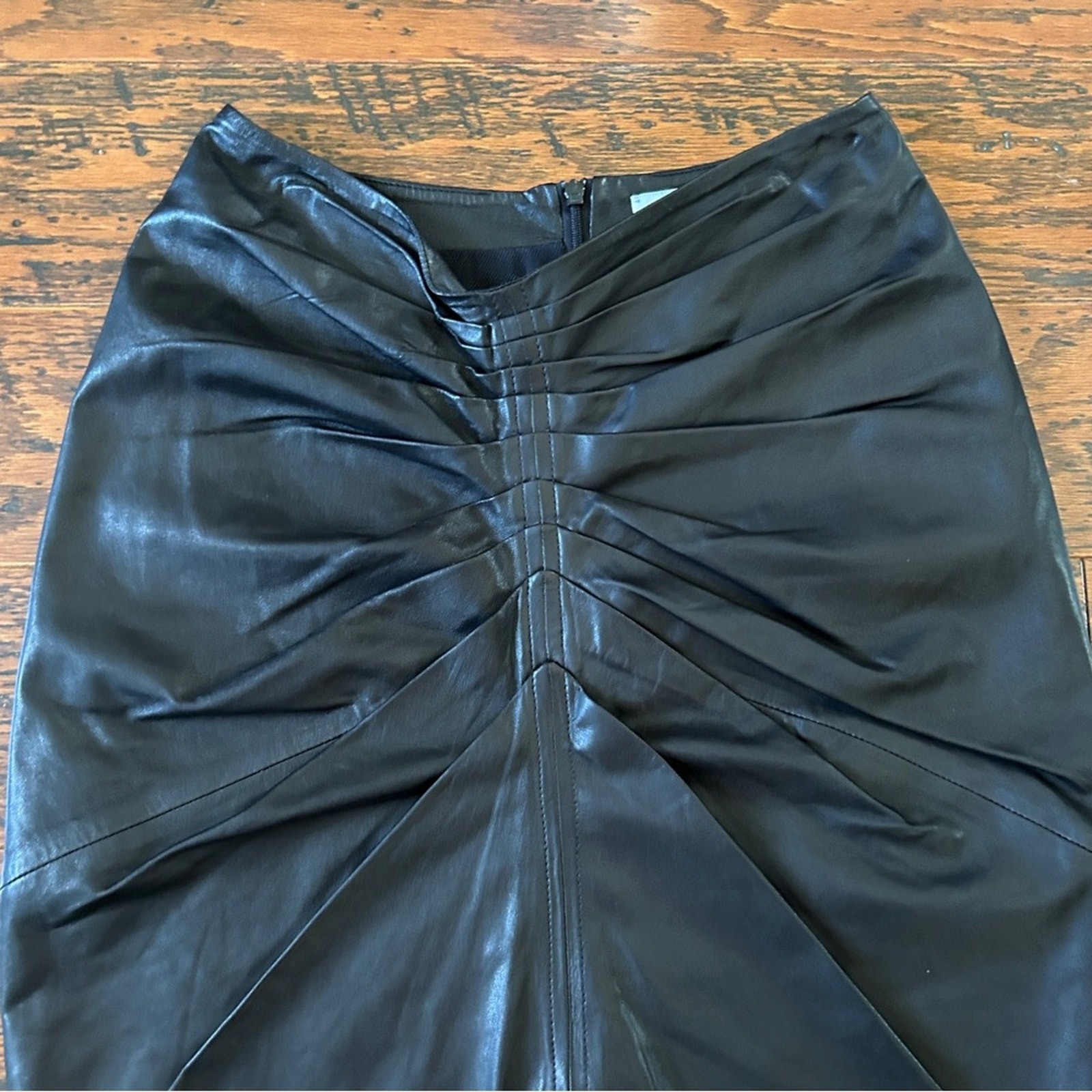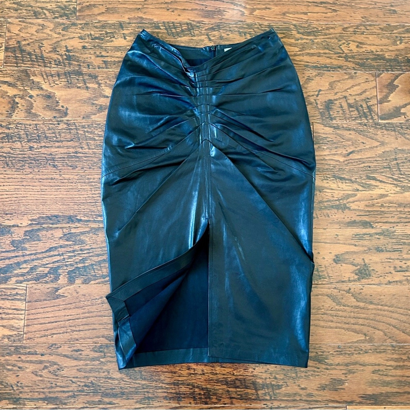 IRO JinJai Skirt Lambskin Leather Skirt Black - Size US 8 NEW with original tags: $995 Retail There is a TINY defect where the back zipper nicked the leather: please see pictures for info - THIS IS NOT NOTICEABLE WHEN WORN but reflected in price Knee length IRO skirt made of supple, mid-weight and stretchy lamb leather Center front is pleated or ruched and sports a tall center slit Fully lined Concealed zip fastening along back 100% Lambskin Skirt measures approx. 29" long and 14" around the waist Revolve Style No. IRO-WQ72. IRO Lambskin Leather Ruched Pencil Skirt in Black sie 8 NWT