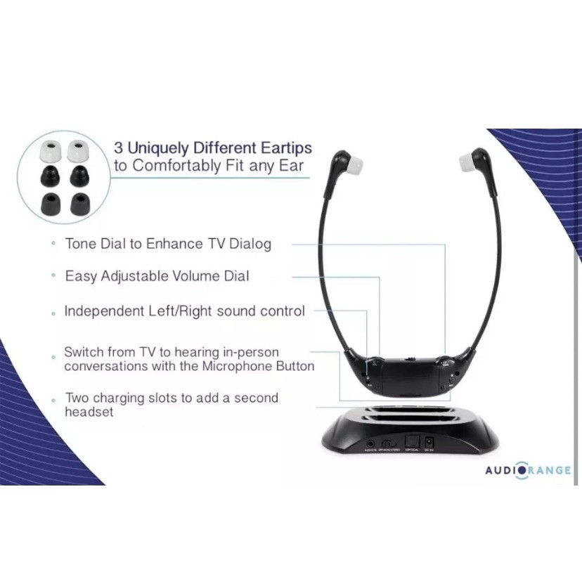 This item is used . It has been TESTED and VERIFIED to be in excellent working condition WIRELESS TV HEADPHONES WITH CRYSTAL CLEAR SOUND - Hear your television loud and clear without disturbing others. These great-sounding wireless tv headphones for seniors and those hard of hearing make watching tv with family and friends much more enjoyable. Includes 1 wireless tv headset with 130dB max volume, 1 fast-charging headset dock with extra charging slot for 2nd headset, and 3 sets of uniquely shaped earbuds for maximum comfort while you sit back and enjoy your programs. EASY SETUP, LIFETIME SUPPORT & COMPATIBLE WITH MOST TVs + STREAMING - No pairing, no passwords, no complicated phone app setup. These wireless headsets for television also work with most devices. Included with every wireless TV headphone system are digital optical and analog audio cables to make these hearing amplifier headphones compatible with most TVs. It even works with streaming services like Netflix, Hulu, & Prime. U.S.-based Lifetime Customer Support is also included with your purchase. FAST-CHARGING, LONG-LASTING 8-HOUR BATTERY & BETTER THAN BLUETOOTH - Recharging your wireless headphones for tv watching is fast and simple with the sleek, quick-charging dock. It comes with slots for two television hearing devices in case you choose to get more than one. Plus, unlike Bluetooth headphones, our wireless RF headphones have no audio lag. Plus you can listen to your TV and headphones simultaneously and at different volumes, and doesn’t require an app to customize your audio settings. NO TV AUDIO DELAYS OR LAG WHEN USING THESE HEADPHONES FOR TV - Say goodbye to headaches, lip-sync delays, static noise, echoing, and feedback. These high-quality head phones for television allow you to customize the voice clarity with a simple dial on the headset. This is an effective TV headset for elderly, hard of hearing, impaired seniors, and those with mild to moderate hearing loss.