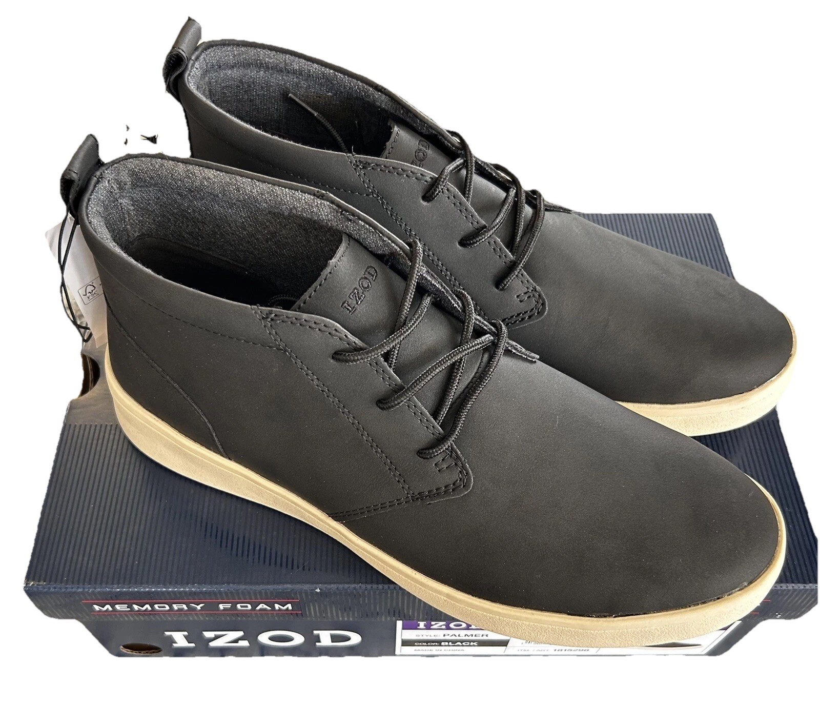 The IZOD Palmer Men's Lace-up Chukka Boots in size 10 are a stylish and comfortable choice for men. These black boots feature a round toe shape with a lace-up closure for a secure fit. The boots are designed with padded memory foam for added comfort and support, making them suitable for all-day wear. The upper material is a combination of textile and polyurethane, ensuring durability and style. These brand new boots come in their original box, ready to be worn for any occasion.