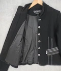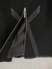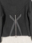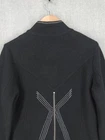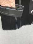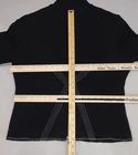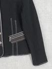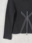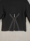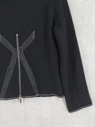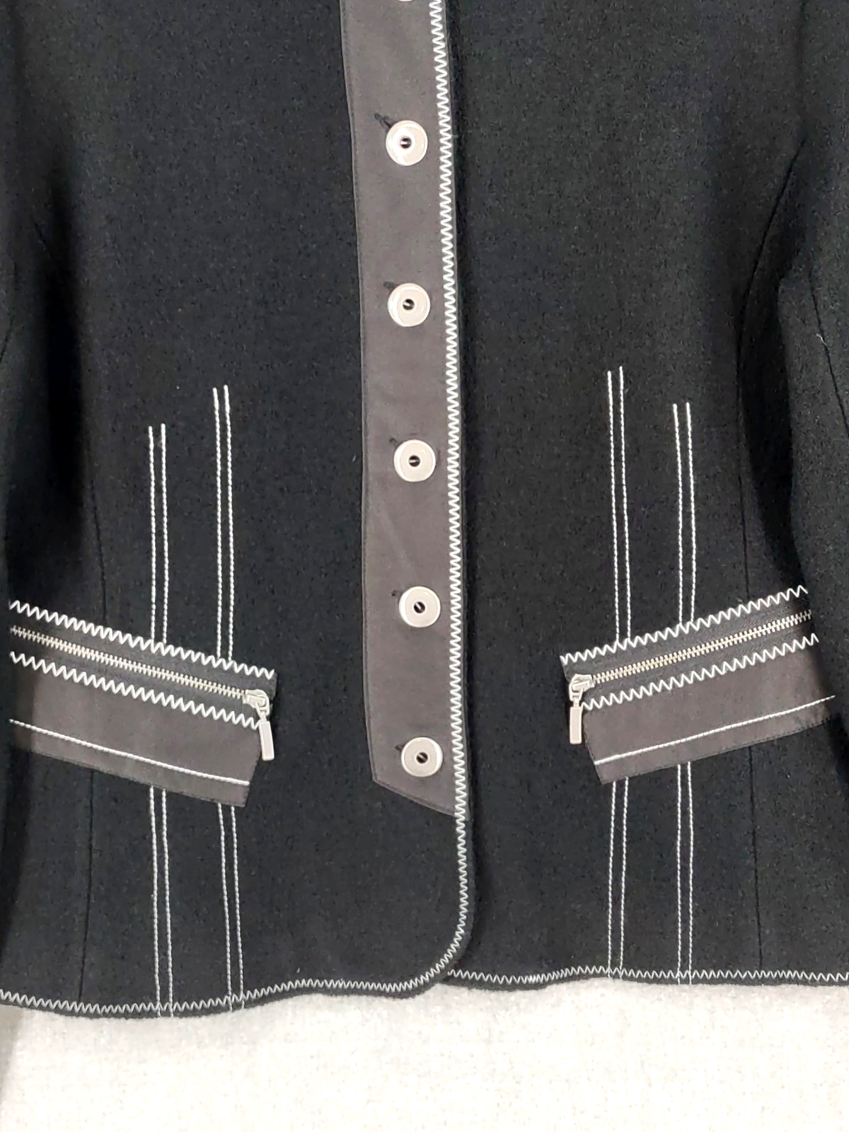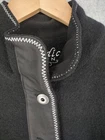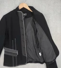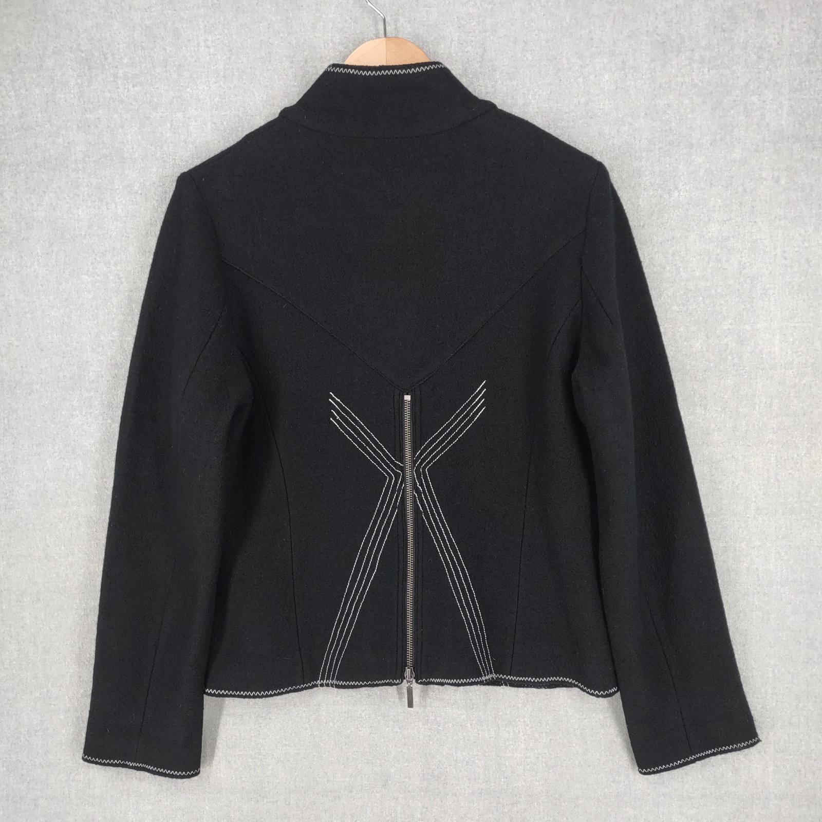 Icelandic Design Jacket Womens Medium Wool Modern Lagenlook Avant Garde Button Up Zip Pockets Condition: Gently worn, no visible flaws. Structure and fabric in excellent condition. Shell: 100% Wool Lining: 100% Polyester Contrast white zigzag and straight stitching on seams and trim for unique visual detail Silver-tone button front with decorative gray placket accent Front features two zipper closure pockets with additional decorative stitching Back has unique X-pattern contrast stitching and zipper accent detail Tag size: Medium (Womens) Brand: Icelandic Design, as embroidered inside the collar Measurements (per photos): approx. 20.5" back length, 19" pit to pit (see ruler in images) Material and care: 100% Wool outer, 100% Polyester lining, dry clean only Color: Black with gray trim and white stitching Modern architectural style—great for casual or elevated outfits