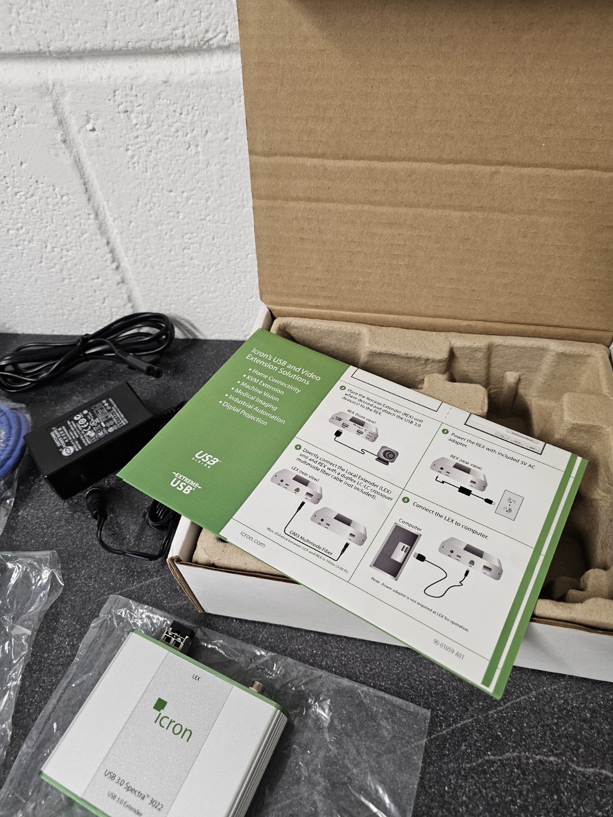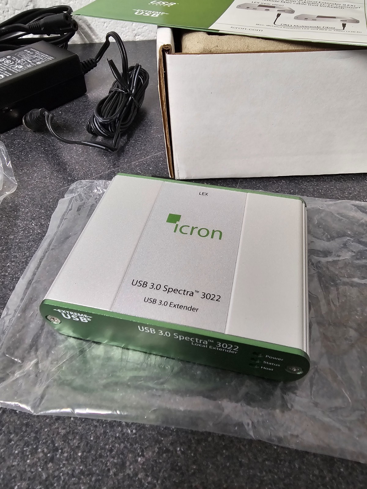 This is opened unused in new condition (tested by us) The box has some shelf ware Description The Icron's Spectra 3022 is a USB 3.0 SuperSpeed extender that can reach up to 100m over a multi-mode fibre cable. Compatible with USB 3.0 at 5Gbps throughput speeds True Plug-and-Play capability, ready to operate right out of the box Supports USB 3.0 throughputs of up to 5 Gbps Delivers speed, isolation, and security over multimode fibre. Integrated 2-port hub suitable for industrial environments The USB 3.0 Spectra 3022 is a two-port USB 3.0 SuperSpeed extension solution, enabling USB 3.0 connections at up to 5 Gbps over 100m/330ft of multimode fiber optic cable. The Spectra 3022 features two locking USB 3.0 ports delivering 900mA power to each port perfectly suited for USB3 Vision camera applications. Fast dispatch Thanks for looking.