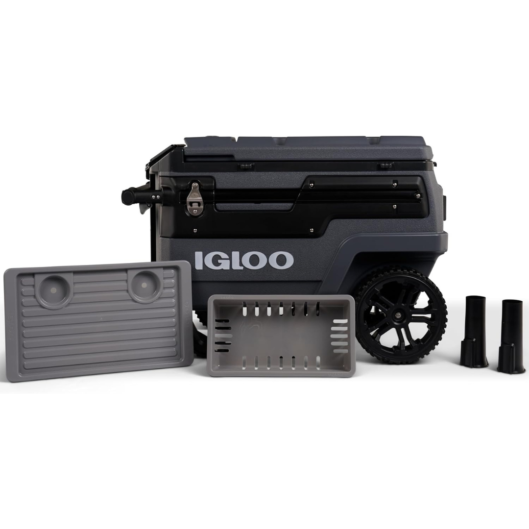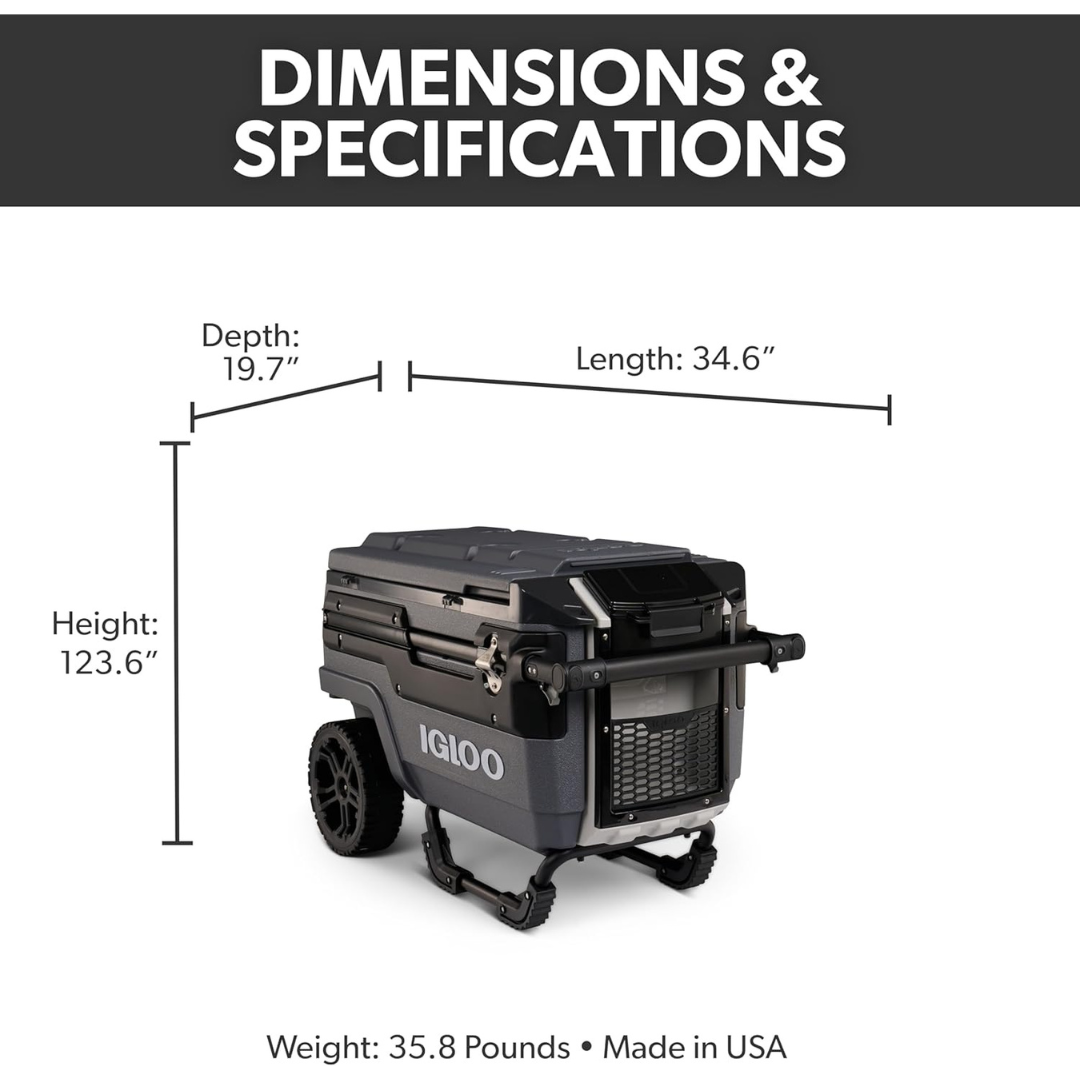 SHIPPING & CUSTOMER SERVICE INFORMATION π¦ β We ship within 3β10 business days from the USA. β Free Shipping β Free Returns β Money Back Guarantee β No extra fees, No import tax β the price you see is the final price! π« We do not ship to warehouse addresses or PO boxes, as this may result in lost packages. Please provide a valid residential or business address. π If you experience any issues with your order, please contact us directly via eBay message . β οΈ Do not open a dispute β we are unable to assist once a case is opened. Direct communication helps us resolve your issue faster and more effectively. π¬ If you see unexpected fees at checkout, it could be related to your location or display settings. But rest assured: we never charge extra β everything is included in the listed price. Thank you for shopping with us! Feel free to reach out anytime if you have questions. Igloo Trailmate Journey 70Qt Wheeled Cooler, Insulated Hard Shell Ice Chest About this item Spacious 70-quart capacity fits up to 112 cans Tackle sand & other challenging terrain with the superior traction & ground clearance of 10-inch, never-flat, smooth-ride wheels Pull your load 50% easier thanks to the comfort & leverage of our horizontal dual-trigger steel Glide handle that has locking & telescoping functions THERMECOOL foam β a cleaner, eco-friendly insulation β in body & lid provides superior ice retention performance Tie-down hooks (using bungee cords or rope, not included) give you more carry options, making it easy to haul things like towels, quad chairs or a surfboard to your destination Product information Item details Brand Name Igloo Included Components Cooler Recommended Uses For Product Camping Model Name Trail Mate UPC 034223349271 Global Trade Identification Number 00034223349271 Manufacturer Igloo ASIN B0C6C572N2 Item Type Name Cooler Item Height 23.61 inches Unit Count 1.0 Count Warranty Description LIMITED WARRANTY. Igloo Products Corp. warrants Trailmate coolers to be free from defects in material or workmanship under normal use and service for one (1) year from the date of original purchase. This warranty is your exclusive warranty and there are no warranties that extend beyond the description contained here. Igloo shall either repair the product or component or provide you with a replacement product or component if it proves defective under the terms of this warranty for the time specified from the date of original purchase. This warranty is not transferable. Owner must present original Proof of Purchase to obtain warranty service. Dealers, service centers, or retail stores do not have the right to change the terms and conditions of this warranty. This warranty is not valid if the product or components have been: (1) used commercially, (2) damaged through abuse, misuse or neglect, (3) damaged in an accident, (4) unreasonably used or used for any purpose for which it was not intended, (5) repaired or altered in any way from its original configuration, (6) damaged due to lightning strikes or other acts of nature. Normal wear and tear, including dents, scratches, discoloration or fading is not covered under this warranty. Loss of parts or components removed from the product is not covered under the terms of this warranty. Igloo is not responsible for incidental or consequential damage resulting from any malfunction. All warranties are limited to a (1) year warranty period. Measurements Capacity 65.8 Liters Item Dimensions D x W x H 34.59"D x 19.7"W x 23.61"H Item Weight 34.7 Pounds Chamber Depth 23 Inches Chamber Height 11.5 Inches Chamber Width 14 Inches Features & Specs Container Type Box Additional Features Wheeled Style Color Carbonite Materials & Care Material Type Plastic Insulation Material Type Polyurethane Foam From the manufacturer