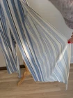 A sophisticated jumpsuit featuring an elegant twist-front design and relaxed wide-leg silhouette in soft blue and white vertical stripes. Versatile piece transitions seamlessly from daytime casual to evening sophistication. • Spaghetti strap design • Twist front bodice detail • Wide leg cut • Lightweight rayon fabric • Side cutout details Small faint spot on fabric near bottom of garment Measurements taken with garment laying flat Measurements are approximate: Armpit to Armpit: 15" Inseam: 25“ 9-0596 13oz