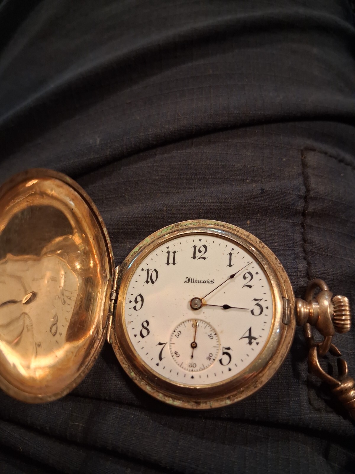 The product is an Illinois pocket watch with a gold filled hunter case, featuring a manual mechanical movement with 15 jewels. It has just been serviced and is a unique and stylish accessory for women. This pocket watch combines classic design with a touch of luxury with its gold filled case and precise craftsmanship, making it a desirable piece for collectors or watch enthusiasts looking for a functional and elegant timepiece.