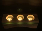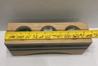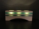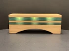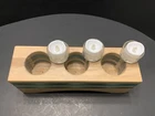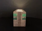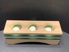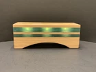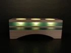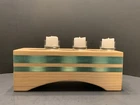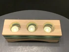 Add a touch of modern and decorative style to any room with this unique Wood and Epoxy Resin Candle Holder. The rectangular-shaped holder measures approximately 10.5 inches in length, 4 inches in height, and 3.25 inches in width, with a light brown wood and green epoxy stripes. It comes with three flameless candles batteries included in glass votives. This beautiful decorative piece is in lovely used condition free of any visible damage. See photos as they are part of my description. This centerpiece is free-standing and features a smooth finish, making it a perfect addition to any occasion or room.