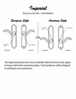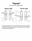 Imperial Privacy Lever Set Crafted in the tradition of fine European door hardware, the Imperial solid brass lever set features slender escutcheon plates in an appealing, classic design paired with the enduring profile of the wave lever. Solid brass construction, secure through-door mounting, all-metal latches, multiple internal springs, and nylon washers insure durability and provide smooth, solid, and long-lasting operation. Many beautiful finishes, including unique distressed finishes, are available to satisfy even the most discriminating tastes. Experience the difference high-quality door hardware can bring to your home! Features: Privacy Button pushes in to lock and automatically releases when the interior lever is turned Solid brass escutcheon plates and levers Available with the lever positioned on the upper or lower half of the escutcheon plate Levers are positively secured to the interior of the escutcheon plates by a metal retaining ring Each lever has an external set screw that prevents lever "wobble" when tightened Slender escutcheon plates to fit your style (Will not cover standard 2-1/8” bore holes, see Technical Details below) Technical Details : Escutcheon plates are 1-3/4” W x 9-1/8” L and will not cover standard 2-1/8” cross-bore holes Please search for the following styles to see wide escutcheon plate options: Diplomat, Envoy, Lavish, Luxuriant, and Royal Lever features privacy latch (locks from interior and automatically unlocks when interior lever is turned; emergency access from exterior) Available with the lever installed on the upper or lower half of the escutcheon plate (please see attached lever placement photo) Available with 2-3/8” or 2-3/4" backset latch (backset is the distance from the edge of the door to the center of the cross-bore hole) Fits standard 1-3/8” interior doors Kits for 1-3/4" and 2-1/4” thick doors are also available; let us know when you order if you need this door thickness Please see the pictured lever set dimension and milling detail photos to ensure door compatibility Matching entry, passage, and dummy sets are available enabling you to use this hardware style throughout your home. Search for: FPL + Imperial + function, for example “FPL Imperial passage”. **Please note** Our Distressed Finishes are all special order items. The Handling time will be 5 days if you order one of these finishes: Distressed Light Bronze Distressed Dark Bronze Distressed Brass **The Handling time for our DISTRESSED NICKEL FINISH is 21 days** **About the Manufacturer** FPL Door Locks has been in business for over 35 years manufacturing mortise locks for sliding patio doors, locks for entry and swing patio doors, privacy and passage mortise box sets and tubular latch sets for bedroom, bathroom, hallway, and closet doors, and much more. A wide variety of styles and finishes are available to satisfy many tastes. FPL door and window hardware is designed to last for many years to come and all mechanisms are backed by a Guarantee for Life Mechanism Limited Warranty. Add lasting value to your investment by choosing FPL Door Locks for all your hardware needs.
