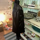 This is an Impressions black satin blouse in size Large, featuring a collared neckline, long sleeves with button closure, and a relaxed fit. Made from a blend of polyester and spandex, it has a vintage style with button accents. The blouse is suitable for various occasions including parties, casual outings, and business settings, and can be worn during all seasons - Winter, Summer, Fall, and Spring.