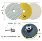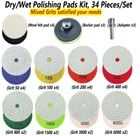 【Diamond Pads Include】: 4" Dry Diamond Plishing Pads 24 Pieces(4XGrit 50 100 200 400, 2XGrit 800 1500 3000 6000) Plus 4 Pieces Wool felt buffing pads Plus 3 Pieces Hook and Loop Backer Pads and 3 Pieces Round shank adapter, total 34 pieces/Pack, economical choice 【About Dry Polishing】: Compare with wet Polishing Pads, Dry polishing pads give flexibility to avoid high cost tools like Wet Polishers, no worry about lot of liquid mess in work area, much more easy and quick to polish stone(Both wet and dry using, not short time dry polishing like wet pads) 【Wide Application】: The 4 in diamond polish pad kit is perfect for kind of surface or edge of quartz, granite, marble, terrazzo floor, glazed tiles, vitrified tiles, natural stone, glass and concrete countertop.etc 【EASY TO USE】: Hook and Loop backing, easy installation and removal, convenient for you to change out. Save time, improve work efficiency; 5/8''-11 thread backing pad with 8mm drill adapter can easily connect to your variable speed polisher, angle grinder, household power drill or other rotary tools. Check your machine thread and speed before use. 【Attention Please】: Operate between 2500-4500RPM to avoid potential damage to your surface, Please insure the speed of machine is less than 4500RPM, Never use them with high speed grinder
