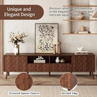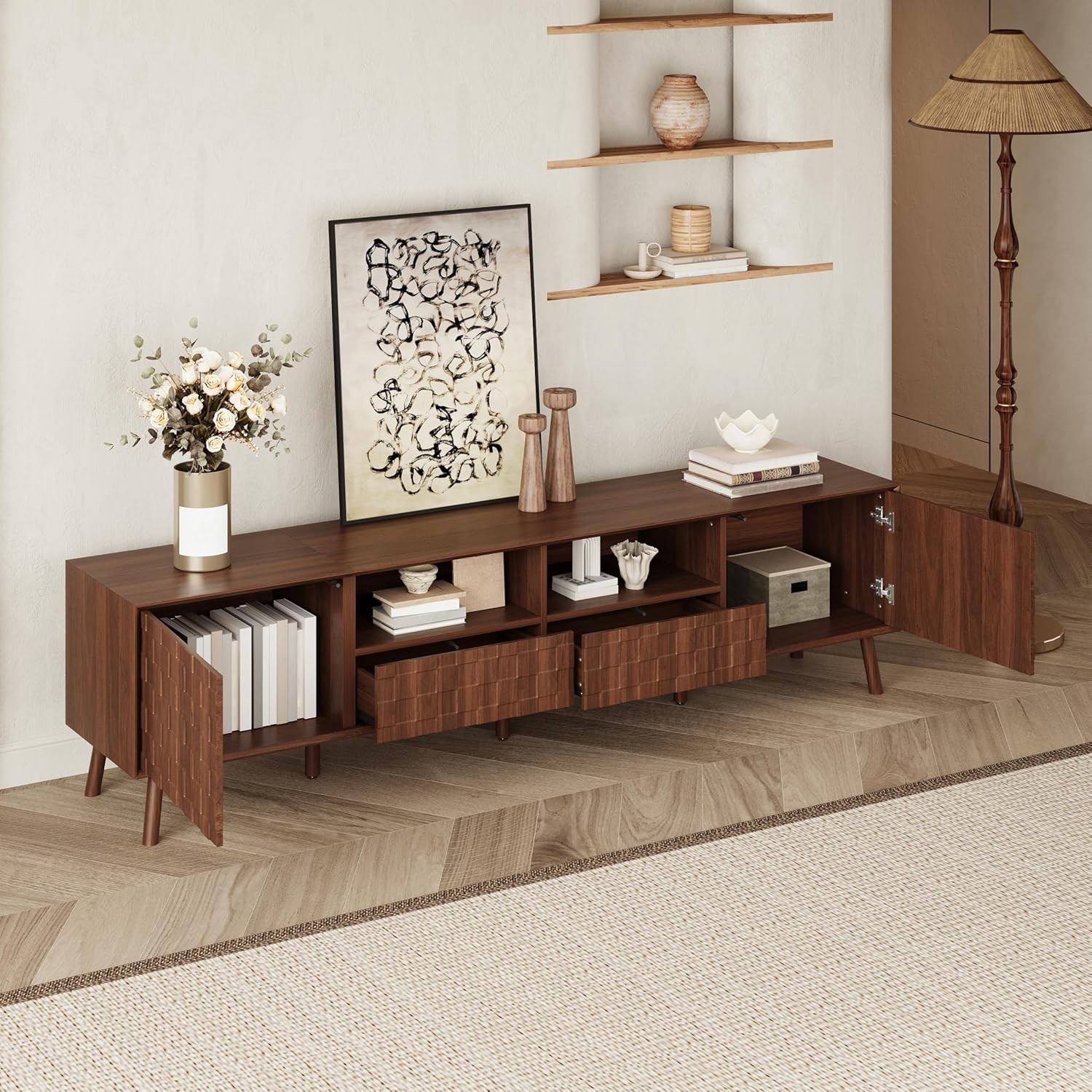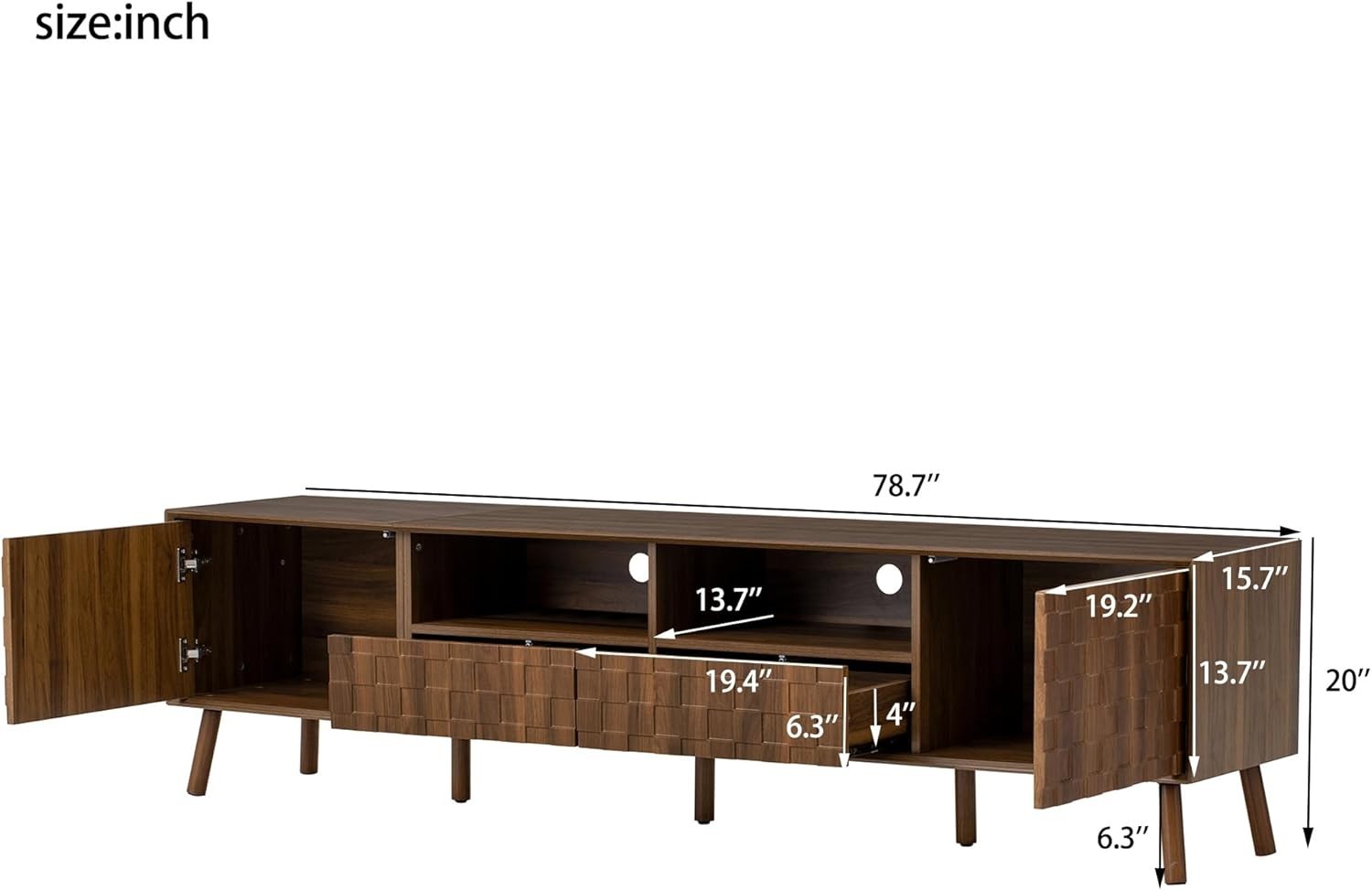 About this item Modern Craftsmanship & Style – Elegant beveled edges and textured square pattern provide a sophisticated focal point that elevates any living room décor. Organized & Accessible Storage – Features private cabinets with smooth push-openers, ideal for media devices, gaming consoles, and everyday accessories. Sturdy Solid Wood Construction – Solid wood legs and robust MDF frame ensure long-lasting stability, safely supporting up to 99 lbs for large-screen TVs. Quiet & Gentle Soft-Close Doors – Soft-closing hinges allow cabinets to close smoothly and silently, reducing noise while adding premium functionality. Integrated Cable Management – Thoughtfully placed cable holes keep wires organized and hidden, maintaining a clean and clutter-free entertainment space. This TV stand is a stylish and modern entertainment center designed to hold a 65 to 85 inch TV with solid wood legs in a sleek walnut color. The assembled dimensions of 78.7 x 15.7 x 20 inches provide ample space for your TV and media accessories. Made in the United States, this product weighs 83.22 pounds and offers a sturdy and elegant design to enhance your home entertainment setup.