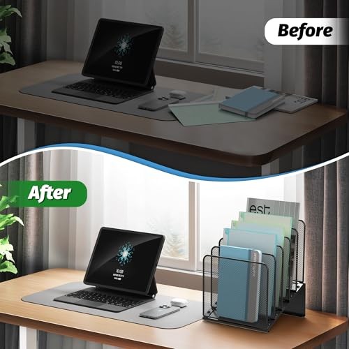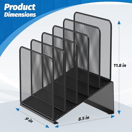 Inclined 5-Section Desk File Organizer, Vertical File Folder Holder File Sorter Desktop Organization for Office Classroom. 【UNIQUE DESIGN】Unique inclined design, easy to use. Mesh hollow design, ventilation and dry, easy to use, beautiful appearance 【5-SECTION FILE RACK】Our five-section metal file rack is the perfect solution! You can easily organize your files, folders, and paperwork. The open design allows for easy access and visibility of all your documents, while the five sections provide ample storage space 【SPACE SAVING】 Help you save more desk space, keep your papers organized, and use your home or office space more efficiently 【EASY TO ASSEMBLE】The office organizer can be easy to install with screws 【STURDY AND DURABLE】 This desk file holder organizer is made of sturdy metal steel mesh with smooth edge and professional black finish, so that it can be more durable and stable, strong enough to hold all your files and papers.