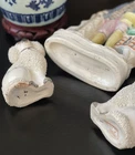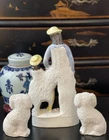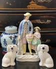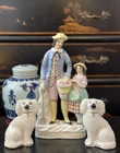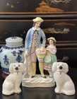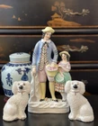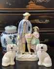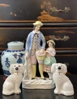 Wonderful Rare Antique English Country Life Staffordshire Mantle Trio β’ Dreamy Spring Coloured 19C Model Depicting Figural Boy and Girl with Basket of Garden Flowers in Victorian England and Wonderful Turn of Century White Textural Spaniel Pair β’ Elegant English Country Life Staffordshire Trio β’ Height 11β/4.5β This rare trio of stunning and most precious rare grand scale English Staffordshire country life themed mantle figure featuring boy and girl with flower filled basket and petite antique textural turn of century spaniel mantle dog pair to display alongside will surely make stunning showpieces when placed on their own or as a marvelous addition to a collection or arrangement, and just in time for spring with dreamy pastel decoration. These models are extremely scarce and rarely if ever found intact since the moulds are so complicated and the figures so fine and delicate. The central figural piece dating from the 1800s has some crazing and light age related hairlines, to be expected and no chips or cracks and enamels in fine condition. Sought after original period characteristic blue tint to glaze abounds in crevices and base underside. The spaniels are excellent with minimal expected age related wear. Wonderful early examples of authentic antique Staffordshire to enjoy and treasure. Glorious. Display ready. Happy Bidding! Happy New Year 2025! πππ