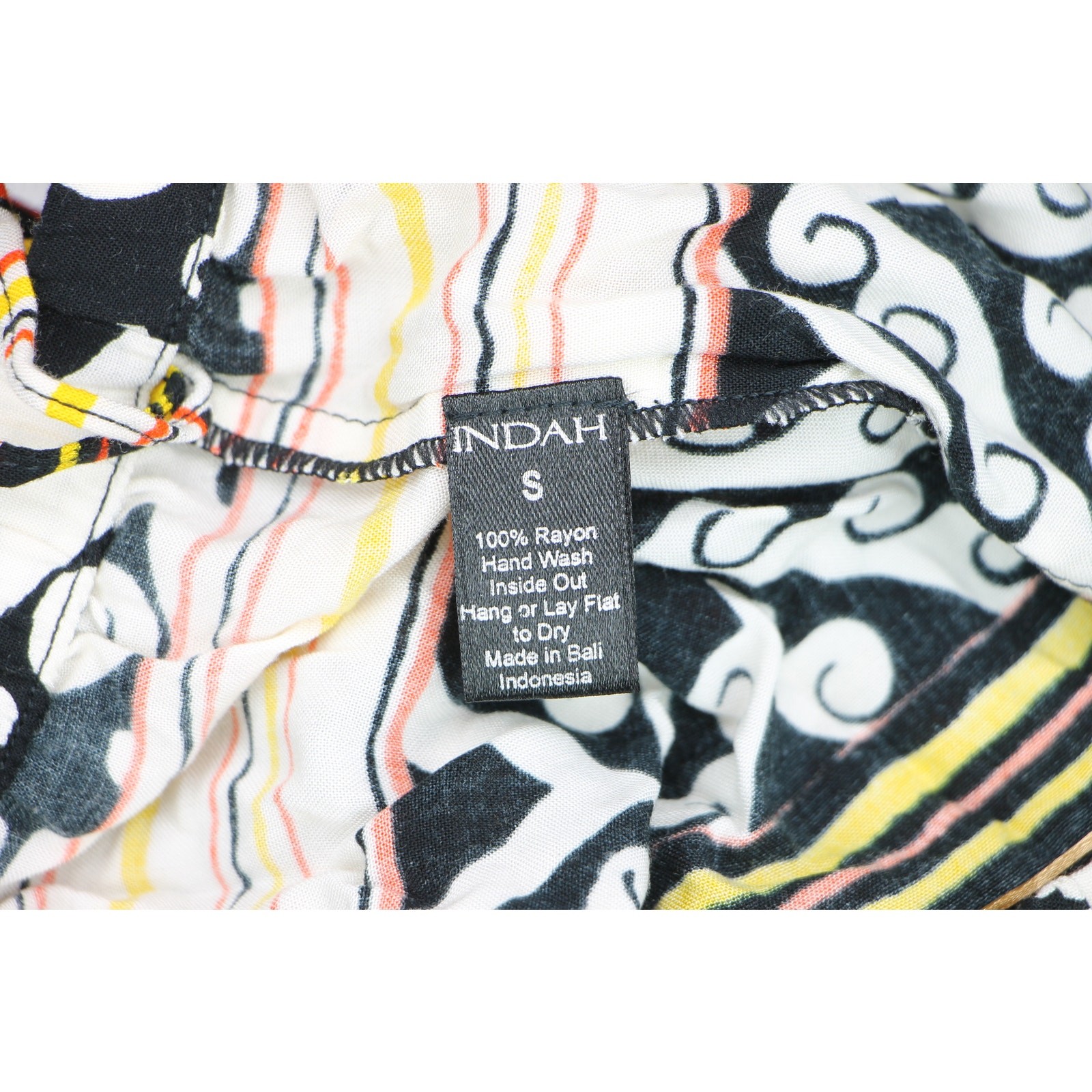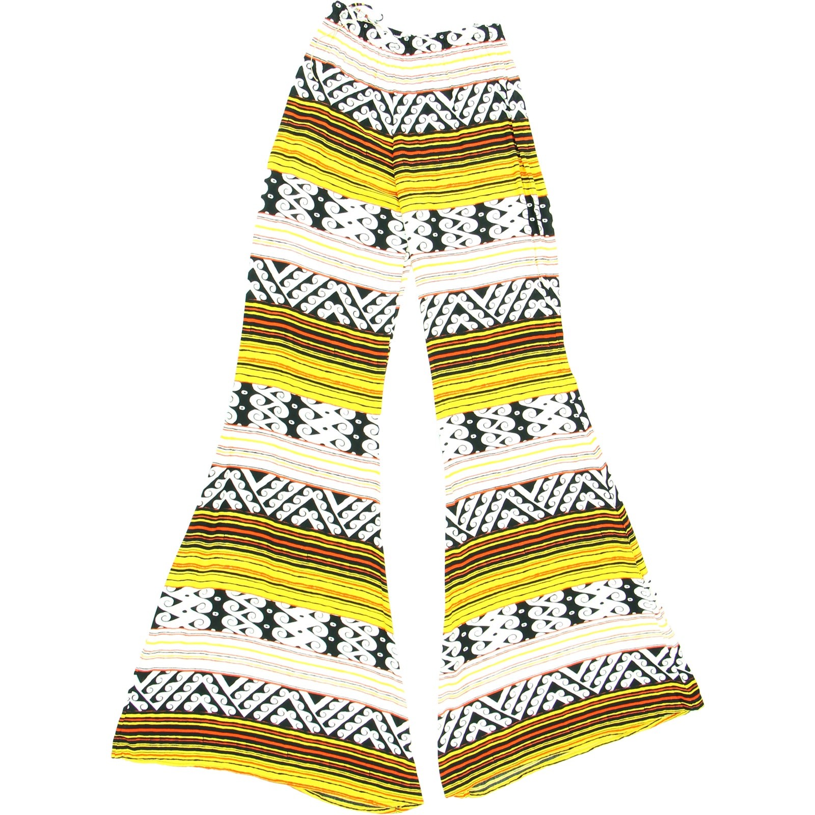Indah Hippie Boho Festival Hipster Groovy Tribal Aztec Palazzo Bell Bottoms Flare Wide Leg Pants material 100% rayon made in Bali Indonesia colors:orange, black, yellow, white new condition size on tag:S waist:11.5-15 hips:17.5 rise:9 inseam:36 leg opening:19 out seam:43 all measurements are straight across # 14176 6j8g6