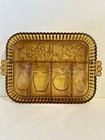 Elevate your serving game with this stunning Indiana Glass Amber Divided Part Relish Serving Dish Tray. The intricate fruit design on the carnival glass adds a touch of elegance to any table setting. Perfect for hosting dinner parties or holiday gatherings, this dish is sure to impress your guests. Crafted from high-quality glass and produced in a beautiful gold color, this relish dish is a must-have for any collector or home chef. Use it to serve your favorite condiments or as a decorative piece in your home.