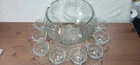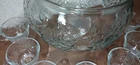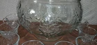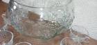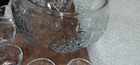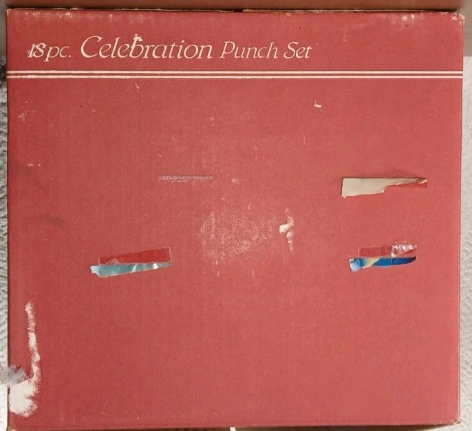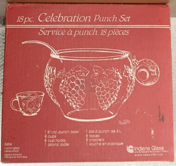 The Indiana Glass Grapes Celebration 18 Piece Complete Punch Bowl Set in Box #5354 is a vintage, elegant glass set made in the United States during the late 20th century. The set includes a round, pressed glass punch bowl with an etched grape pattern, along with a ladle, hooks, and 8 cups. This mid-century modern style set is perfect for all occasions and features a clear color with intricate design details. The product is a vintage original and comes in its original packaging, making it a unique and collectible addition to any home.