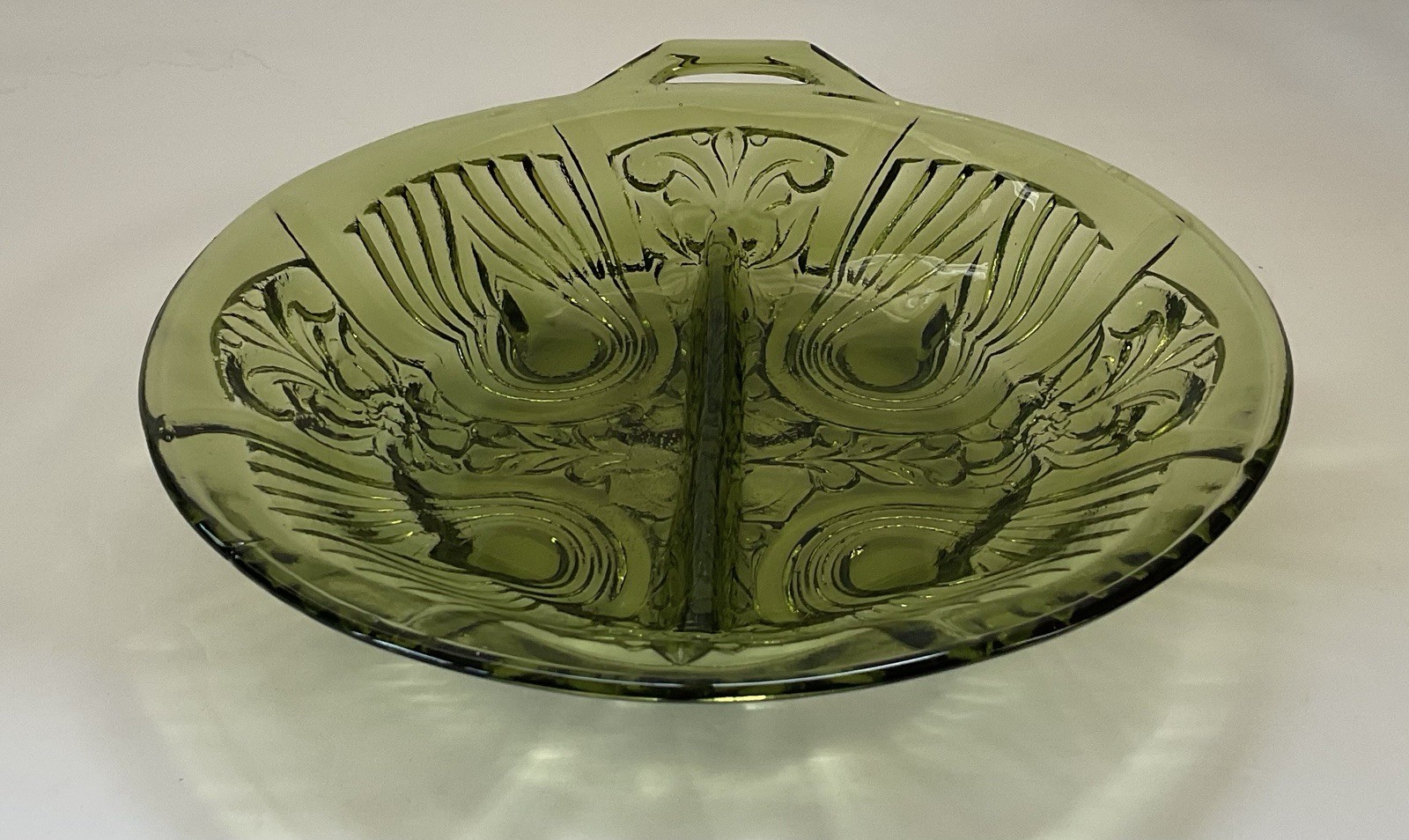 Number of Items in Set:oneCapacity:UnknownMPN:NoneProduct Line:Indiana GlassVintage:YesColor:GreenType:Candy DishProduction Style:Art GlassTime Period Manufactured:1970-1979Country of Origin:United StatesOrigin:AmericaNumber of Compartments:2Item Length:7.5inShape:RoundFinish:GlossyCare Instructions:Hand Wash OnlyPattern:All-OverFeatures:DecorativeItem Height:1.5 InProduction Technique:UnknownOriginal/Licensed Reproduction:OriginalMaterial:GlassTheme:NONEBrand:Indiana Glass