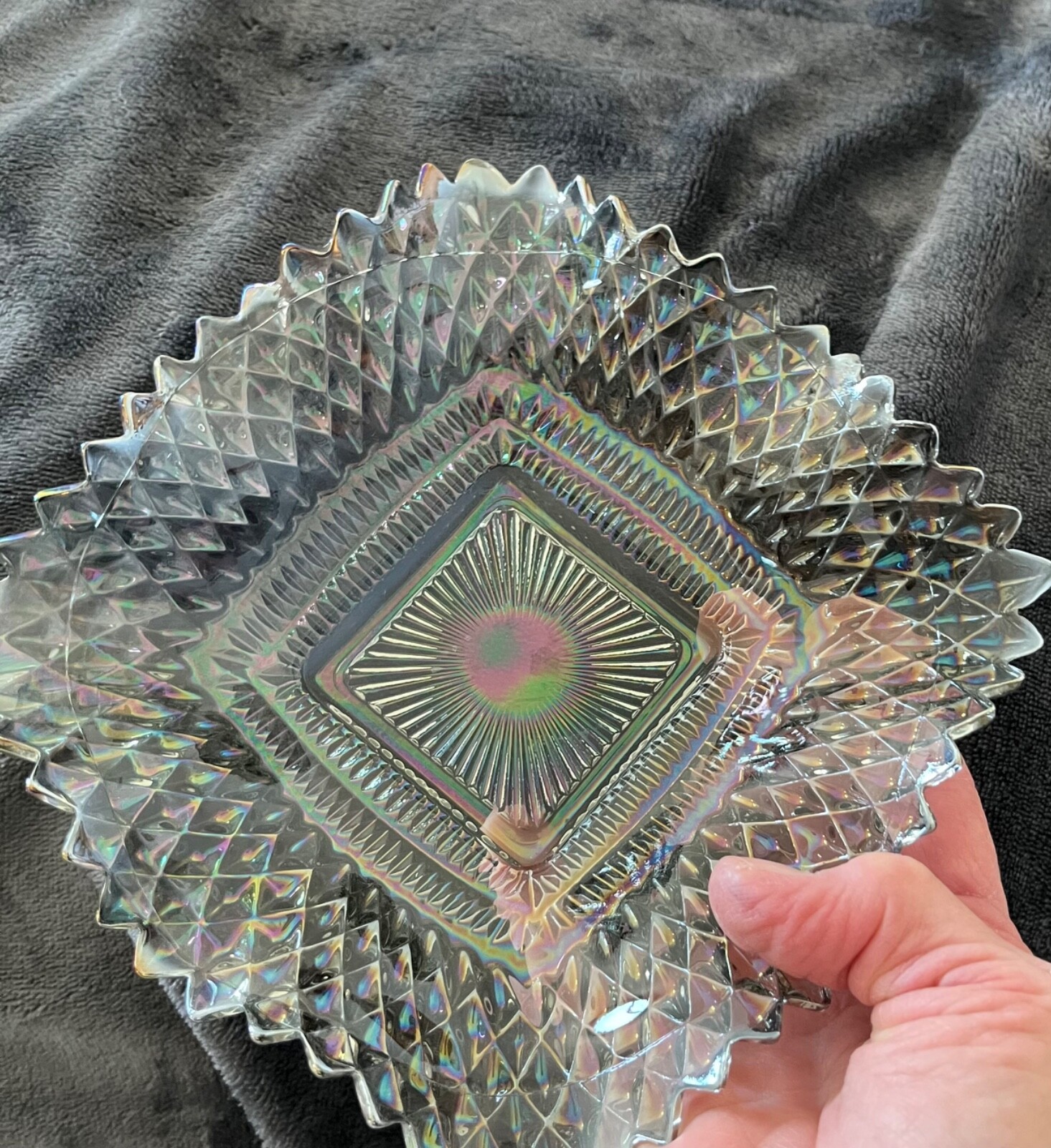 Experience the charm of vintage elegance with this Indiana Glass Smokey Gray Iridescent Ruffled Diamond Point Edge Dish Bowl. Crafted in the 1950s, the piece boasts a stunning diamond pattern, pressed glass production style, and a captivating gray color that exudes a timeless allure.Perfect for storing your cherished trinkets or as a decorative piece to enhance your home's aesthetic, this original bowl is a testament to the craftsmanship of its era. Its ruffled edges add a touch of sophistication, making it a delightful addition to any collection or decor.