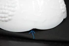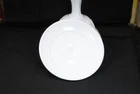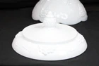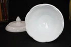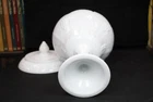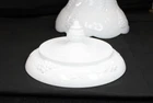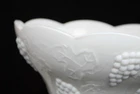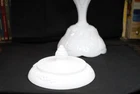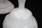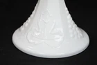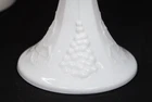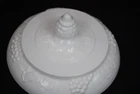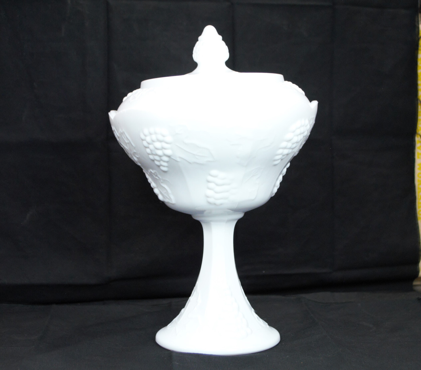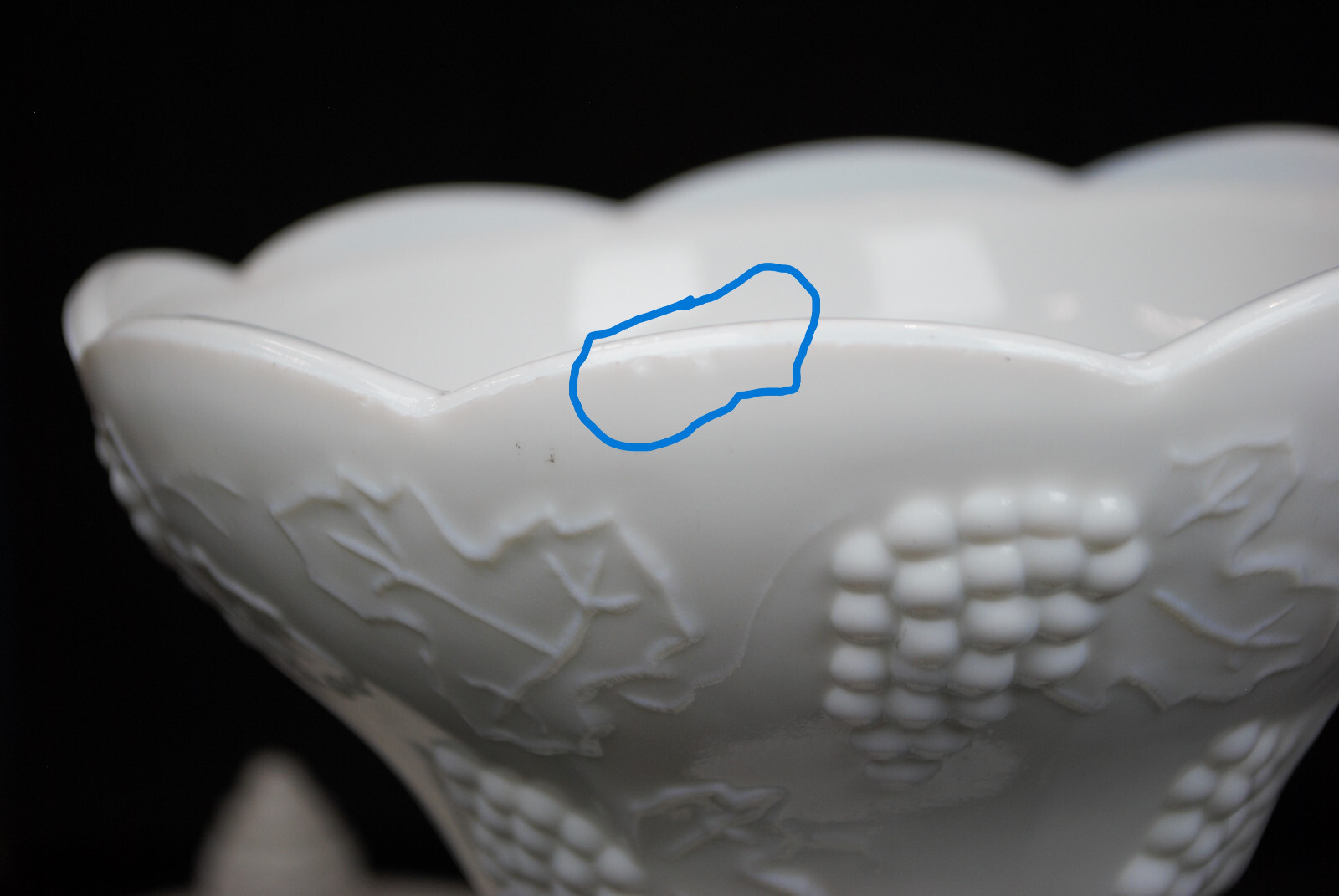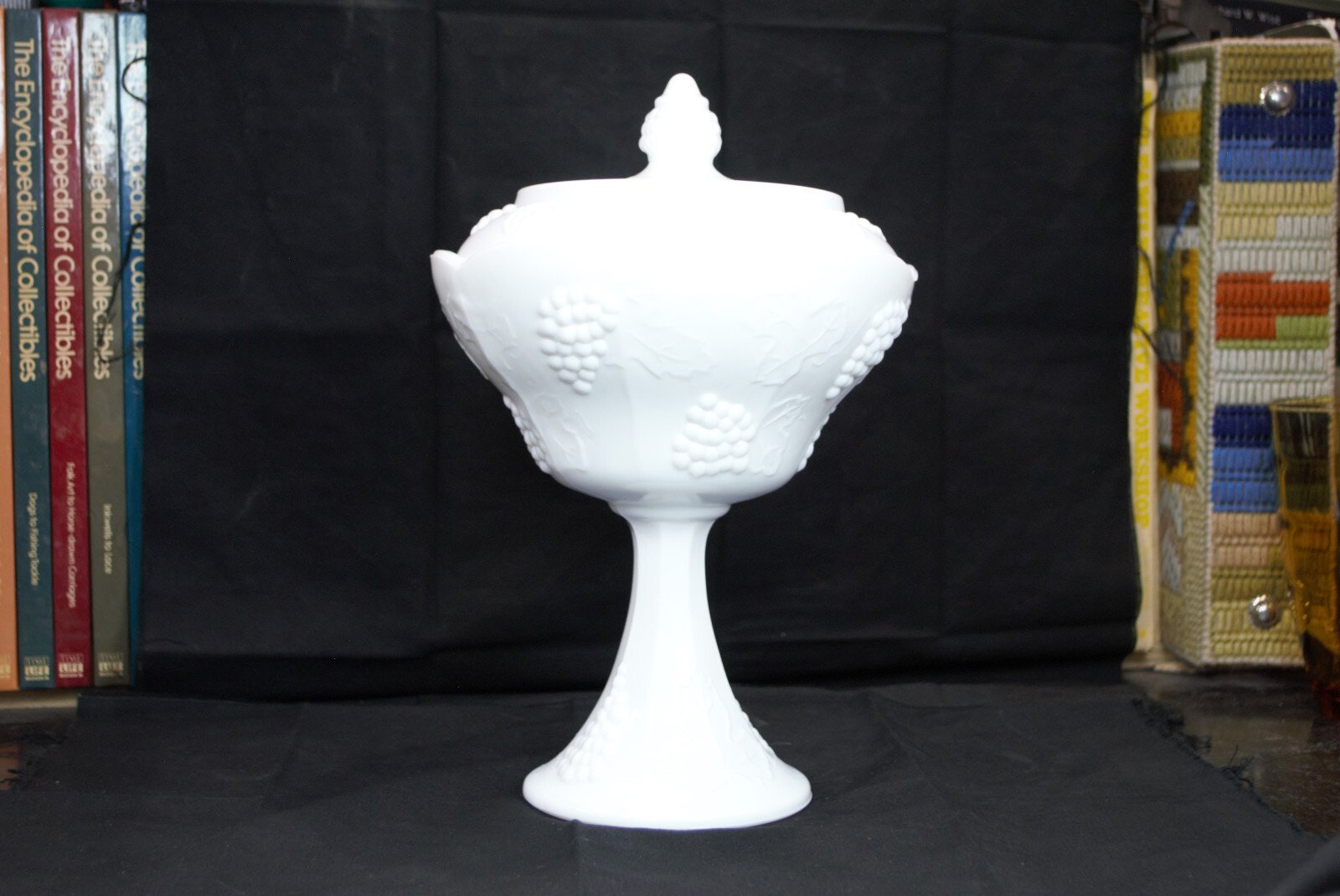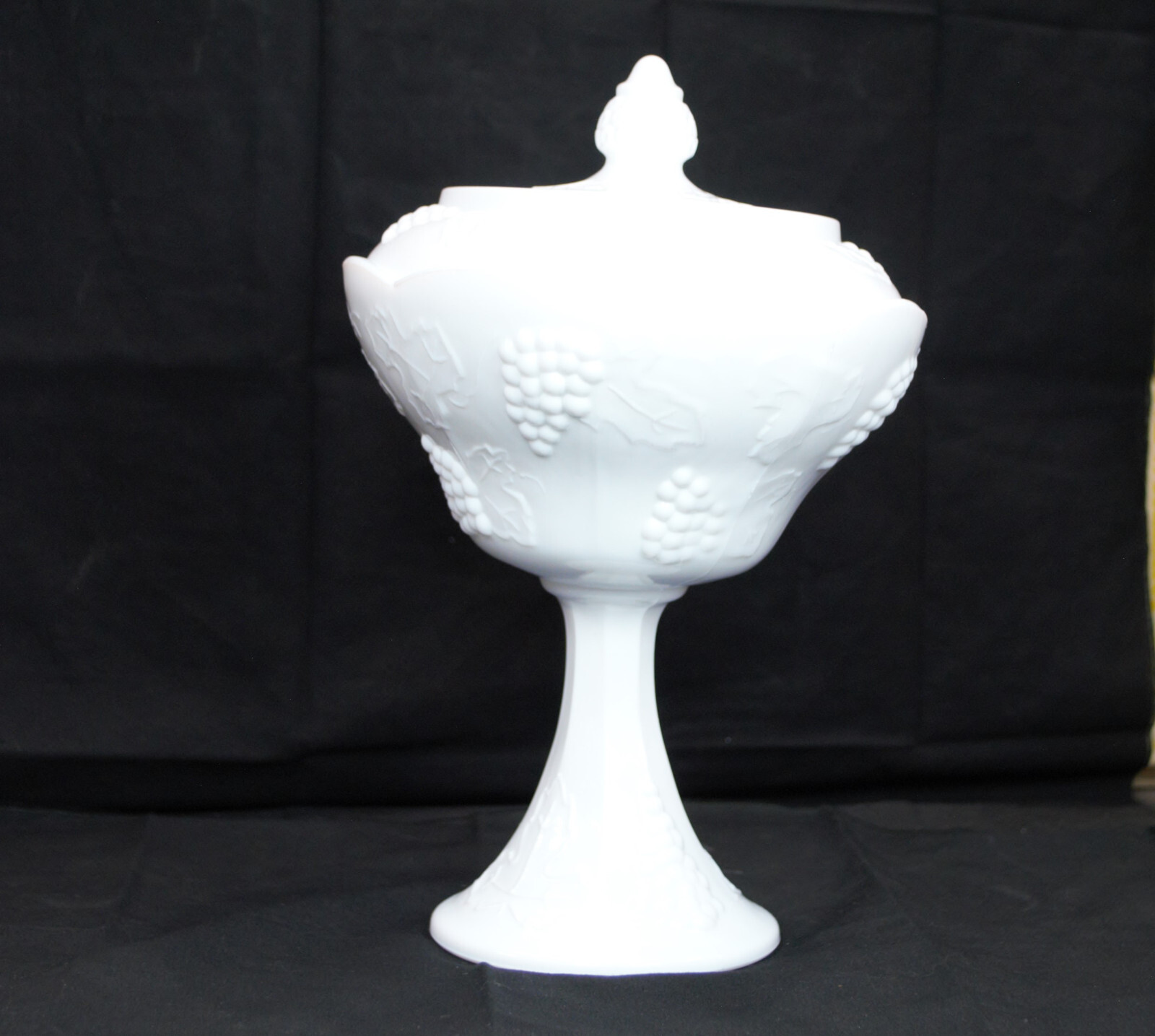 Vintage Indiana milk glass pedestal style bowl or compote. Colony Harvest pattern. Has grapes and leafs on it plus an acorn at the top. Nice piece even with the chips. Also this piece does lean a little. It does not stand up straight. It will need a better cleaning than what I gave it. The chips are inside the blue circle in the pictures. The piece measures without the lid on the high side 7 and 7/8" and on the low side 7 and 1/2" and with the lid on about 10 and 1/4" roughly. The top measures 6 and 3/4" across and that is from outside to outside, the bottom measures 4 and 1/8" across. The piece weighs 3.2 pounds. as is condition please refer to the pictures for more description items will need to be cleaned better I do estimate high on the shipping weight Shipping is an estimate cost buyer to pay for actual shipping cost No international shipping free local pick up available within 3 days from the purchase date questions please Thanks