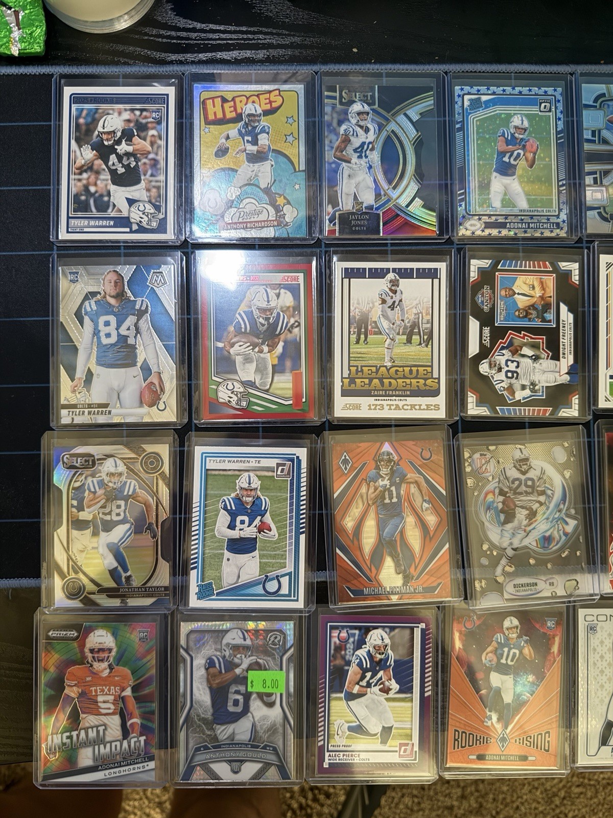 This product is a lot of Indianapolis Colts football cards, featuring a rookie card of Peyton Manning, who is a legendary player for the team. The cards are standard sized, made of card stock, and are original prints licensed by the National Football League (NFL). These sports trading cards are in English and manufactured by Panini, and include inserts that add to their value as collector's items. Perfect for any Indianapolis Colts fan or football card enthusiast, this lot offers a piece of NFL history with a piece of memorabilia from one of the sport's greatest players.