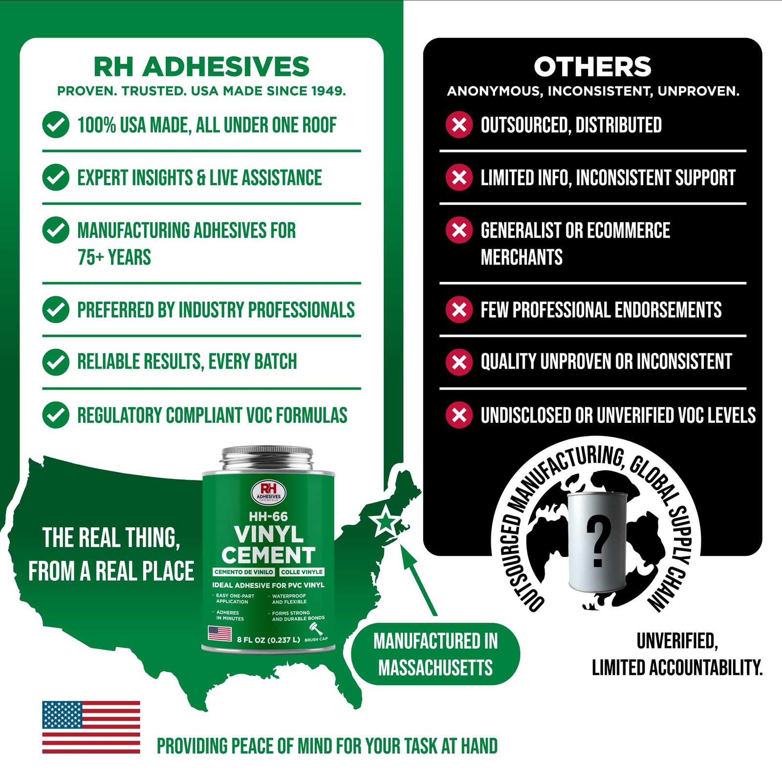 HH-66 Vinyl Cement, 8 oz. can - Vinyl Adhesive, Cement Glue, Repair Glue, Inflatables, Pool Liner, Tarps, Tents, Awnings, Mats, Covers, Waterproof, High Strength, Long Lasting, RH Adhesives Bonds in Tough Conditions – You can apply our American made vinyl adhesive in temperatures ranging from 35 to 95 degrees Fahrenheit (from 2 degrees to 35 degrees Celsius), as well as underwater, and it will stay malleable Sturdy and Flexible – Our highly regarded HH-66 Vinyl Cement sets the industry standard for vinyl material repair, maintenance, and manufacture Repair Multiple Types of Vinyl – Use HH-66 Vinyl Cement for sealing stitched seams, applying decals, applying patches, and adhering moldings, and it works well with PVC vinyl, canvas, cork, fiberglass, foams (EVA, nitrile, vinyl), glass, leather, neoprene, vinyl-coated materials, vinyl films, and wood Brushes on Smoothly – Use the included brush or a roller to apply the adhesive to the vinyl fabric or to the hard plastic, and it will go on smoothly Made in the USA - RH Adhesives manufactures all its superior products in the USA and has been doing so proudly since 1949 Featured Applications – Ideal for flexible PVC vinyl repairs such as tarps, awnings, pool liners, geomembranes, bounce houses, inflatable boats, marine vinyl, sports field covers, mats, upholstery, and more Shipping We offer FREE shipping on all orders! We ship within Three business days of payment, usually sooner. We use a selection of shipping services such as UPS, FedEx, USPS etc. We only ship to the lower 48 states, no APO/FPO addresses or PO Boxes allowed. Local pickups and combined shipping options are not provided at this time. Return You can return a product for up to 30 days from the date you purchased it. Any product you return must be in the same condition you received it and in the original packaging. Payment Payments occur through eBay. Feedback Customer satisfaction is very important to us! If you have any problem with your order, please contact us and we will do our best to solve any issues. Contact Us If you have any queries, please contact us via ebay. We usually respond within 24 hours on weekdays. Please visit our eBay store to check out other items for sale! Thank you!