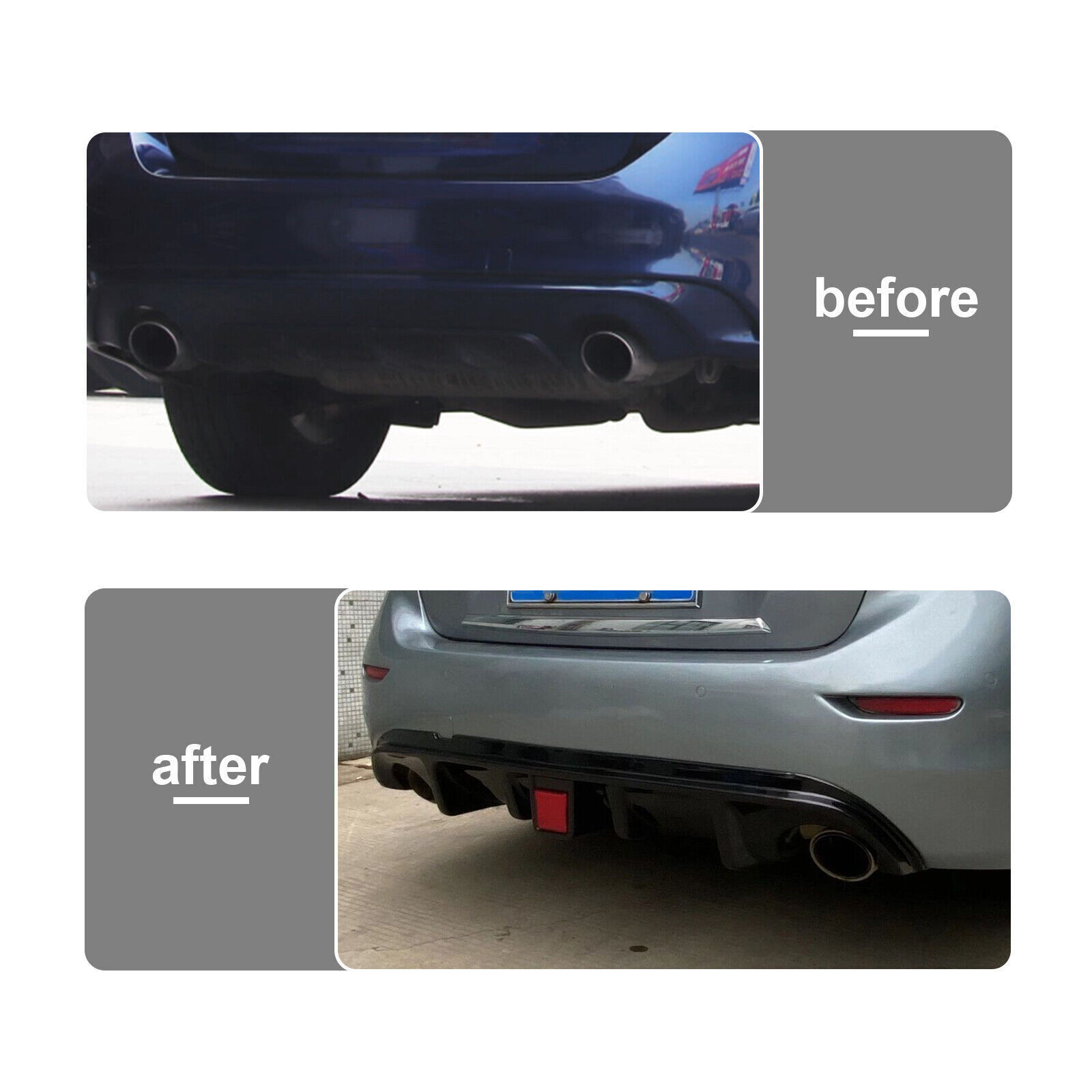 This spoiler and diffuser combo completely transforms the look of my Q50—aggressive, sleek, and perfect fitment. The carbon fiber finish is high quality, and installation was straightforward. No drilling needed, just clean and secure. The diffuser adds a sporty touch while improving aerodynamics. Definitely worth the upgrade for anyone wanting a more dynamic stance. Shipping was fast, and the parts arrived well-packaged. Highly recommend for Infiniti owners looking to stand out!