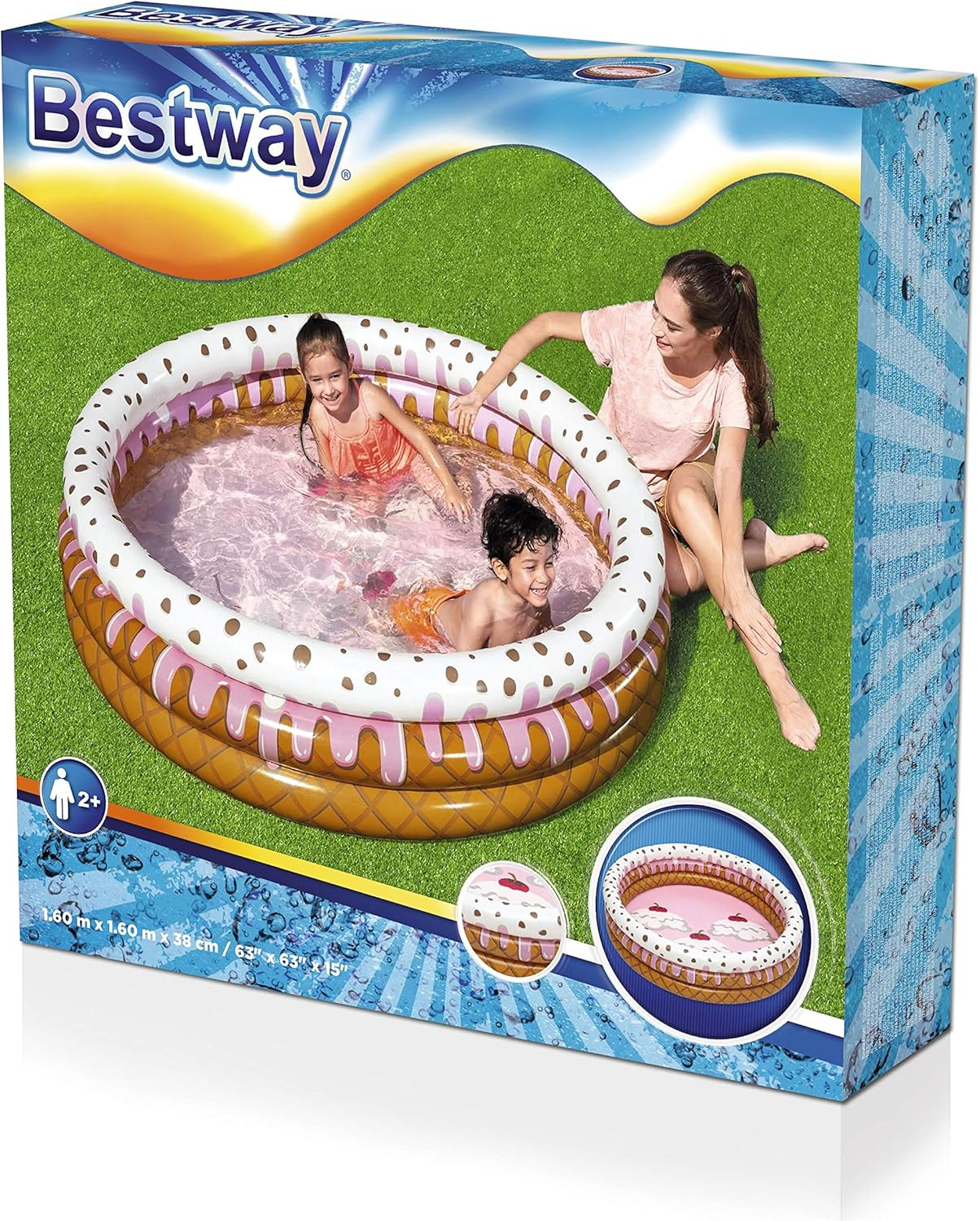 Inflatable Pool Sundae Funday Ice Cream Printed Kids Outdoor Fun Size: 160 x 38 cm 3 Ice Cream Air Rings Durable PVC Water capacity: 390 litres Contents: 1 paddling pool, 1 repair patch Exciting and endless bathing fun for children - with the paddling pool from Bestway! For exercise and lots of fun outdoors. The quality tested Sundae Funday paddling pool is the focus of fun. Three equal sized rings make the ideal pool for little ones. We all scream for ice cream! And your kids will definitely scream with excitement when you set up the Bestway Sundae Funday Pool. The Bestway Sundae Funday Pool is a cool treat for a hot summer day! The children's pool is easy to inflate and easy to store. Product details: • Inflated size: diameter 160 x 38 cm. • Size when uninflated: diameter 150 cm. • Recommended age: 2 years and up. • Water capacity: 390 litres. • Printed as waffle ice cream on the inside and outside. • 3 x identical air rings. • Made from durable vinyl • Includes self-adhesive repair patch Item model number 51144 Item Weight 3.43 pounds Assembly Time 5 minutes Capacity 390 Liters Assembly Required No Color Colour Special Feature Portable, Lightweight, Foldable Material Polyvinyl Chloride (PVC) Occupancy 2 Global Trade Identification Number 06942138968163 Batteries required No Shape Round Frame Material Polyvinyl Chloride (PVC) Age Range (Description) from 2 years Included Components Sundae Funday Paddling Pool 160 x 38 cm Target Audience Unisex-Kids Product Dimensions 62.99"L x 62.99"W x 14.96"H Number of pieces 6 62.99 "h x 62.99 "h x 14.96 "h. Weight: 3.43 lb Shipping from the USA All of our products are shipped from the USA, ensuring quick delivery to your destination. Payment We offer the following payment methods: PayPal, credit card, bank transfer, and eBay's secure payment system. Free Shipping & Free Returns Shipping within the USA is FREE. Additionally, any return is absolutely free for you. Risk-Free Purchase You have the option to return an item within 30 days without any justification. We cover the return shipping costs! Fast Shipping We ship immediately upon receipt of payment. Generally, the package is delivered within 2-3 days in the USA. If it takes longer, we will contact you. Quality and Costs Made in Europe, USA, China No customs fees or additional charges Total satisfaction guarantee Invoice with declared VAT available upon request in .pdf format Feedback Your feedback is very important to us. After you pay for your purchase, you will automatically receive positive feedback from us.