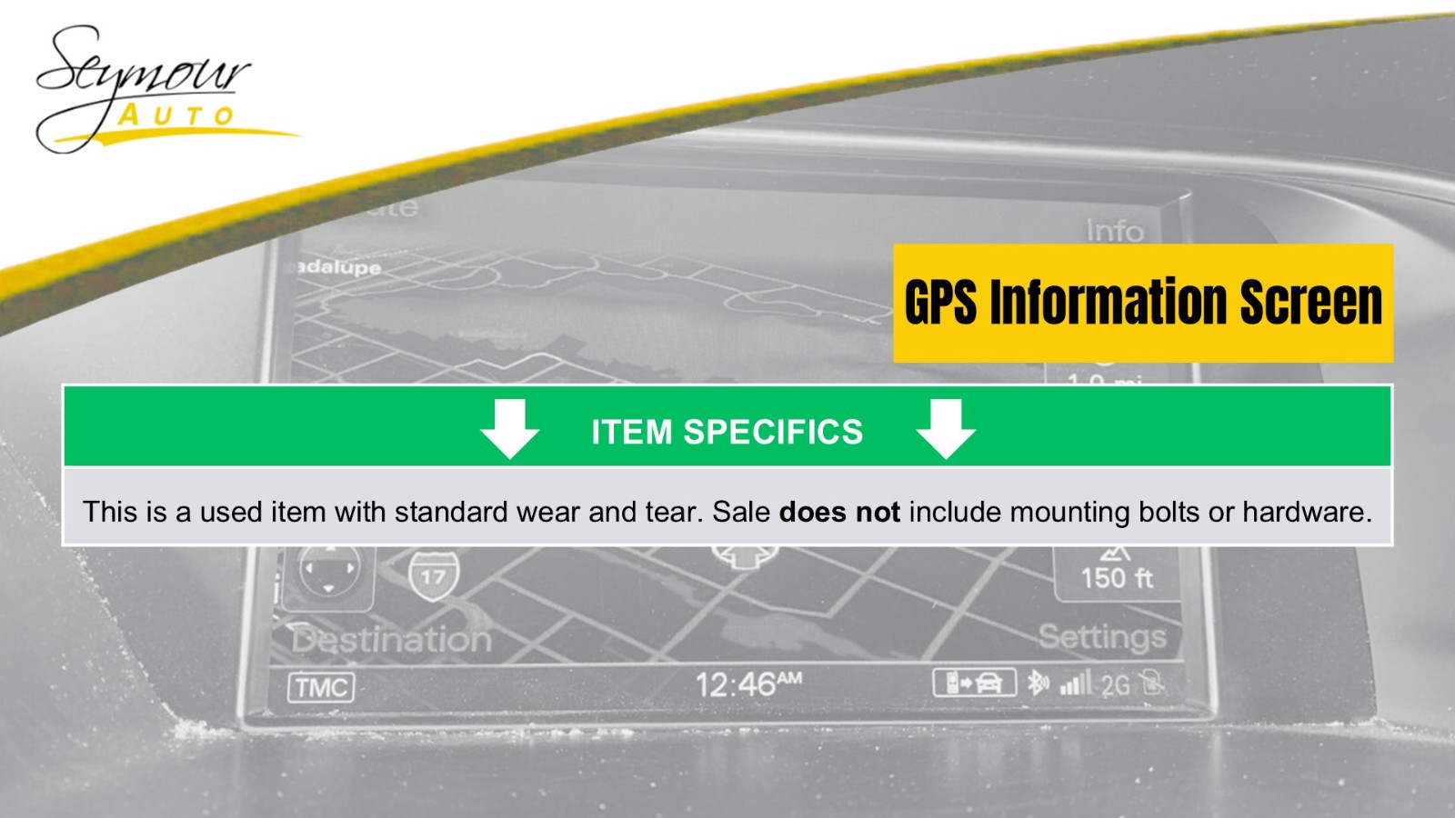 Welcome to our eBay Store! Info-GPS-TV Screen Front Without Navigation System Fits 11-12 MKZ 1381757 Description **6 Month Warranty + Free Shipping ** Donor Vehicle VIN: 3LNHL2JC6BR769003 Model: MKZ Year: 2011 Mileage: 0 (0 = not available or unknown) Stock Number: 05442 Store Number: 1 Part Detail Part Grade: A Part Category: U Part Placement: Notes: This part will fit these makes and models with these options MKZ 11-12 Front; w/o navigation system WARRANTY / GUARANTEE Most parts we sell through eBay Motors come with a 30 day money back guarantee unless otherwise stated. The 30 day period starts when you take possession of the part. No labor warranty is provided. In the event a part sold with a warranty fails to operate within the warranty period we will replace the part(s) with a functionally equivalent part or refund the part purchase price, at our option. No refund on deposits or unwanted special order parts or special "cut" items. To return an item you must contact us via eBay Message within the 30 day period to obtain a RMA number (return material authorization). Original shipping charges and return shipping charges are not refunded. Once you obtain an RMA number, ship the item back to Seymour Auto Wrecking 107 New Haven Rd Seymour, CT 06483 along with the RMA number. SHIPPING NOTES ABOUT US HELP Seymour Auto Wrecking ships to US addresses within the 48 states only via UPS ground. No Alaska, Hawaii, Puerto Rico, APO, FPO or PO Box's at this time please. No International shipping is available at this time. Pick up at our facilities is available. Please email us prior to your purchase to arrange pick up. Items will be shipped within 1-2 days of purchase. Please allow 5-10 days for delivery. Most areas in the US are within 5 days. No expedited shipping is available. If an item arrives damaged, please contact us via eBay Message within 24 hours for instructions. If you have a question about a part please contact us BEFORE purchasing. Our main contact method is by eBay Messages. We try to answer all messages within 24 hours. If we are unable to answer your questions before the listing ends the item will be re-listed again soon for you to purchase.