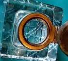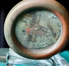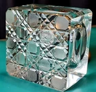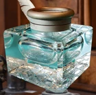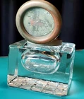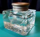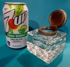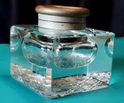 This is a large, heavy, paperweight-like lead crystal glass inkwell, with a theme of the “Foxhunt” skillfully painted on the cap. The cap and rim assembly are brass. Did I mention it’s heavy? It is so impressively heavy that I view it more as a paperweight. Well-to-do Victorians often favored classic gilt-mounted silver, crystal, or cut-glass inkwells. Others preferred stylish porcelain pieces featuring lush, hand-painted figural, floral, or scenic motifs. Silver novelties, replicating calvary helmets or celebrating soldiers, were also popular. So were outright inkwell oddities, like ram-horns mounted with silver detail or real, taxidermy horse-hooves. Elegant, Art Deco Era inkwells were often made of onyx, marble, or cube-cut glass. Others, featuring solid brass bodies, were capped with contrasting copper, cut glass, or bronze lids. Brown, black, and butterscotch-hued Bakelite beauties were abundant as well.