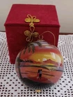 Beautiful inside painted round hand blown glass ornament. Design features an adult couple on the beach, palm trees, an amazing sunset, and mountains. Small area of glue next to the gold accent is somewhat noticeable. Red velvet box is included. Please review the pictures and reach out with questions