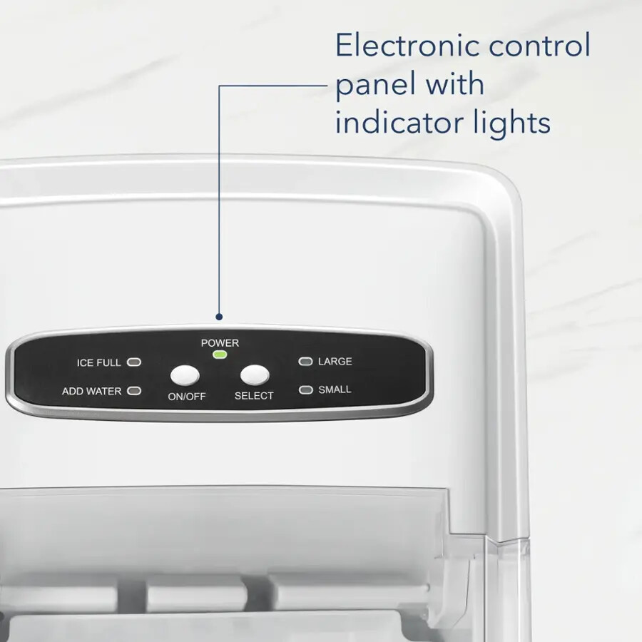 Two cube sizes Enjoy small .25 oz. ice cubes and large .32 oz. ice cubes to fit various glass sizes. Produces up to 19 lbs.* of ice per day Lets you stock up for your next get-together. 1.5 lb. storage capacity Gives you plenty of ice for any occasion. Auto shut-off Ensures ice production stops when the bin is full to prevent overflow. Removable basket and ice scoop Gives you easy access to your ice. Quick production cycle Creates ice every 6 to 13 minutes to keep you supplied with fresh ice. Large water tank Holds up to 2.1 qt. of water. Self-recycling water system Automatically uses water from melted ice to make new ice. Electronic control panel with indicator lights Makes using this ice maker simple and straight-forward.