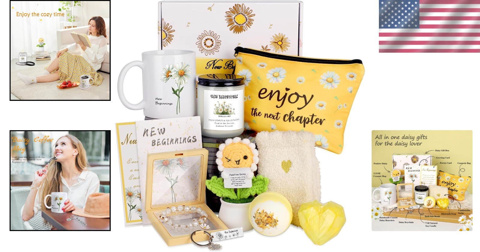 Inspirational Daisy Gift Basket - Candle, Keychain, Bracelet ‹ › ‹ › ‹ › ‹ › ‹ › ‹ › ‹ › ‹ › ‹ › Inspirational Daisy Gift Basket Heartwarming Daisy Gift Box - Surprise your loved ones with the New Beginnings Gift Basket, filled with hope and charm. This exquisite gift basket includes: Natural soy candle Elegant coffee mug Daisy bracelet Charming keychain Cosmetic bag Crochet flower daisies Cozy socks Bath salt bomb Diamond soap Greeting card and poetry card Perfect for Celebrating New Starts Imagine the joy on their faces as they unwrap this beautifully crafted Daisy Gift Box. A soothing scented candle and charming daisy keychain bring warmth and inspiration, making it ideal for: College graduations New job celebrations Housewarming gifts Farewell gifts for coworkers Relaxation gifts for women Thoughtful and Uplifting Gifts Brighten someone's day with the New Beginnings Gift Box. Inside, they’ll find a comforting bath salt bomb, cozy socks, and a crystal daisy bracelet, all designed to uplift and inspire. The lovely daisy theme and "new beginnings" message make it a heartfelt gift for any transition. Perfect for Life’s Transitions From the elegant ceramic mug to the positive knitted daisy flowers, each item is thoughtfully chosen to bring joy. This gift box is perfect for life's significant transitions: New jobs Breakups Divorces Co-worker departures Job promotions A Versatile Gifting Solution Suitable for various life transitions, the Positive Energy Daisy Gifts is perfect for: Going away gifts Inspirational gifts for women Funny coworker goodbye gifts Wishing someone good luck This thoughtful gesture is ideal for parents, hostesses, brides, sisters, best friends, bosses, coworkers, and loved ones. Each item radiates positivity and joy, making every new chapter in life special. Embrace New Beginnings With our daisy-themed gifts, you can celebrate every cherished moment with love and joy, reminding your loved ones that every ending is a new beginning! Shipping Free & Fast Shipping - We offer free shipping to most of the USA with a normal delivery time of 3-10 business days. However, due to various situations, additional delivery time (up to 3 weeks) may be required for some items. Alternative Carriers - We may use alternative carriers (e.g. USPS, FedEx, UPS, etc.) to ensure your package arrives safely and on time. Due to the use of multiple carriers, we are unable to provide a tracking number automatically. Handling Time - Orders are processed and shipped within 1-5 business days of receiving cleared payment. Shipping Restrictions - Shipping to Alaska, Hawaii, Puerto Rico, Guam, and other US territories may incur shipping charges or delivery restrictions. Please contact us before ordering, or your order can be refunded/cancelled. State Restrictions - There may be restrictions based on your state of purchase. For example, certain items may not be shipped to California due to state regulations. Contact for Tracking Updates - If you require tracking updates or have any concerns about the delivery of your order, please feel free to contact us, and we will be happy to assist you. Return 30-Day Hassle-Free Returns - We want you to be completely satisfied with your purchase. If you are not, you can return the item within 30 days of receiving it for a full refund or exchange. Easy Return Process - To start a return, simply contact us and we will provide you with a prepaid return shipping label and detailed instructions. Restocking Fee - There are no restocking fees for returns. However, the buyer is responsible for return shipping costs if the return is not due to a seller's error. Refund Processing Time - Refunds will be processed within 5 business days of receiving the returned item in its condition. Payment We accept all major credit cards, PayPal, and Apple Pay for your convenience. Your payment information is secure and encrypted to ensure a safe and seamless transaction. Please complete your payment within 3 days of purchase to avoid any delays in shipping. Feedback Your feedback is extremely important to us. We strive to provide the best products and customer service possible. If you are satisfied with your purchase, please take a moment to leave us a positive review. If you have any concerns or issues with your order, please contact us before leaving negative feedback. We are committed to resolving any problems and ensuring your satisfaction. Contact Us If you have any questions or concerns, please feel free to out to our customer support team. You can contact us through the eBay messaging system. We are available Monday to Friday, 9:00 am to 5:00 pm EST, and we will do our best to respond to your inquiry within 24 hours. Buy it now and enjoy a pleasant shopping experience! Unit Quantity: 2.83 pounds Material: Plastic,soy wax,ceramic,cotton,paper,metal Type: Gift Box Size: Medium Number of Items: 1 Color: Yellow Occasion: Graduation Recipient: Multipurpose Origin: California Shape: Round Style: Glam