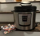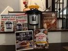 6-in-1 Multi-Functional Cooker--Pressure Cooker, Saute/Browning, Slow Cooker, Rice Cooker, Steamer & Warmer (retail $180) Large, easy to use control panel with ten built-in Smart Programs, automatic keep-warm, and 3 temperatures for saute/browning and slow cook Delay cooking time up to 24-Hours; Manual setting up to 120 minutes of cook time, UL and ULC certified with 10 proven safety mechanisms; Highly energy efficient Includes 3-ply bottom stainless steel cooking pot, stainless steel steam rack, rice paddle, soup spoon, measuring cup, instructions, recipes, and cooking time tables Capacity: 6L/6.33 Qt, Power rating: 1000W, Voltage: 110v/60Hz, Gross weight: 14.57 pounds ; Refer User Manual page -17 for Trouble shooting steps ____________________ (5) cookbooks retail $95 Package retails $275