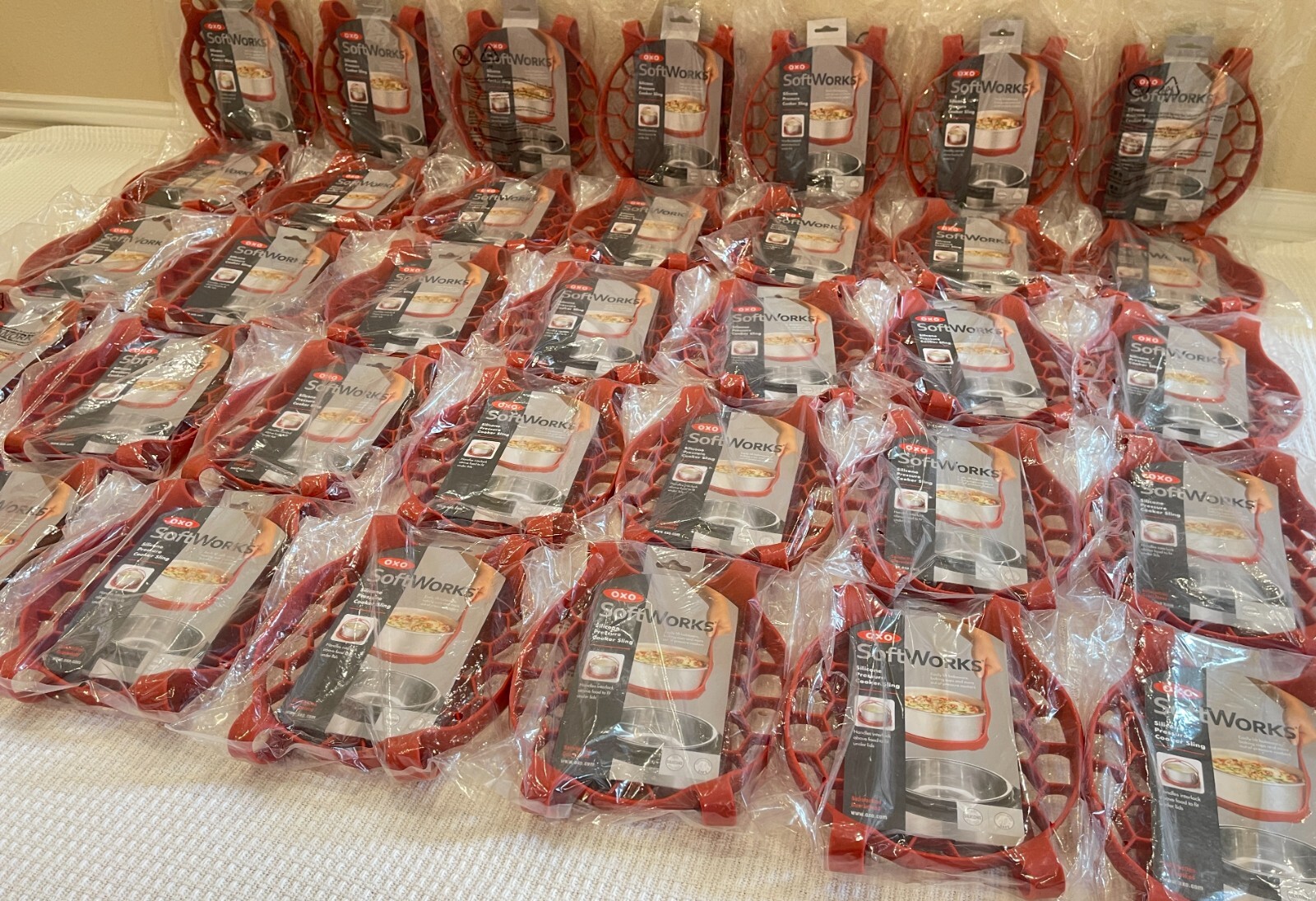 Lot of 35 NEW with Tages OXO Softworks Silicone Pressure Cooker Sling - With ALL PACKAGING INCLUDED!! All individual packaging included for each item: - New, undamaged label with tag to hang item on peg hook - Individual plastic bag for each item with warning label printed Items are stored in a clean, smoke free environment. PRODUCT INFO: SUMMARY Your days of crafting homemade foil slings to remove hot pans from the pressure cooker are over. OXO has the perfect solution: This flexible silicone sling fits under the pan and has large loop handles that offer a solid grip so you can safely and easily lift the pan after pressure cooking. This Pressure Cooker Sling lets you seamlessly remove bakeware from any pressure cooker or multi-pot -- fumble free. Make cheesecake, lasagna, steamed rice and even mini frittatas in your pressure cooker without worry, thanks to the durable, easy-to-use design. Food-safe, heat-resistant silicone construction elevates dishes and springform pans above water for even cooking, and the interlocking handles fit neatly under lids while staying safely above food. Safely removes hot bakeware from pressure cookers, multicookers and Instant Pots. Great for cheesecakes, lasagna, frittatas and more. Stay-cool handles protect hands for swift, safe pan removal without spills. Food-grade silicone is BPA-free and easy to clean. Dishwasher safe. ADDITIONAL INFORMATION Handles interlock above food to fit under the cooker's lid. Elevates bakeware above water during cooking. USE & CARE Microwavable. Dishwasher safe. Thank you for considering our listing. We greatly appreciate the business. We strive to respond to messages and offers instantly in most cases. Fast Same Day or Next Business Day Shipping!!! ALL items are cleaned and stored in a smoke free environment.