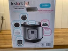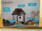 The Instant Pot Duo Crisp + Air Fryer 6 Quart is a kitchen appliance that combines pressure cooking, slow cooking, air frying, roasting, baking, and broiling functions in one. It has a 6-quart capacity and comes in black. The brand of the product is Instant Pot. Brand new in box.