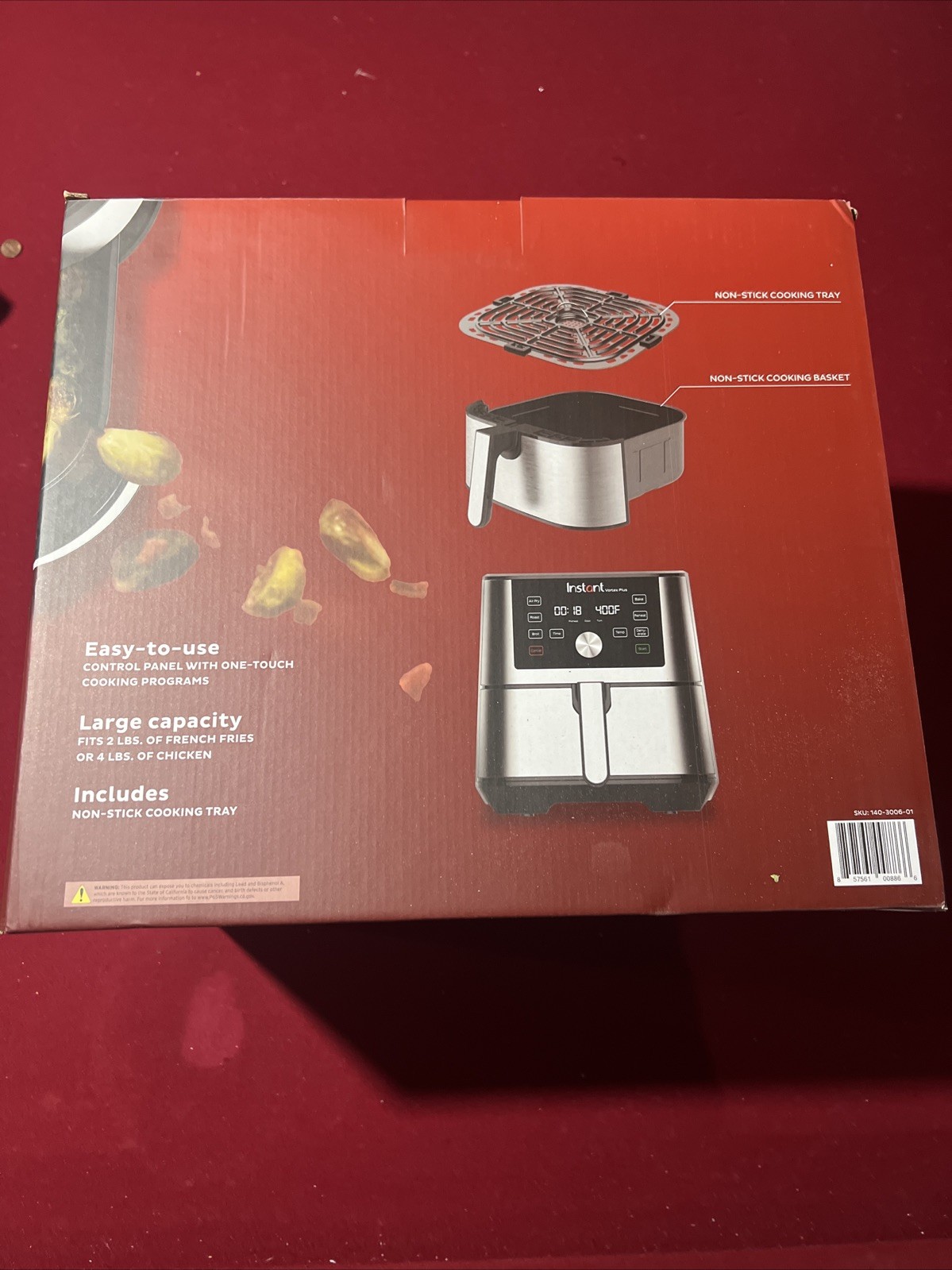 The Instant Vortex Plus 6 Quart Air Fryer in Stainless Steel is a powerful electric appliance with a 1700W motor. With a 6-quart capacity and six settings/programs, this air fryer allows you to cook multiple dishes at once with ease. The included cooking tray makes it convenient for preparing your favorite meals quickly and efficiently. The sleek stainless steel design adds a touch of sophistication to any kitchen, while the one-year manufacturer warranty ensures peace of mind.